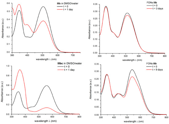 Monitoring of the evolution of the absorption and emission features of FONs made from dyes I–IIIa in water over time.