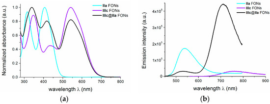(a) Normalized absorption spectra of FONs IIa, IIIc and IIIc@IIa in water; (b) Emission spectra of FONs IIa (λexc = 406 nm), IIIc (λexc = 542 nm) and IIIc@IIa (λexc = 406 nm).