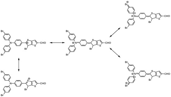Compound Ia represents the key-point of the implemented approach. Ia was prepared with good yield (76%) via Suzuki cross coupling between commercially available reagent 1 and 5-bromothieno[3,2-b]thiophene-2-carbaldehyde, adapting standard protocols reported in literature for similar 2,2’ bithiophene compounds [16]. A first attempt of direct bromination of Ia in order to get IIa was done by using 2.1 eq of NBS and a similar protocol as in our previous work [15]. The reaction was monitored by TLC, showing first an intense stain and a weak one close in Rf. Sequential addition of small amounts of NBS induces an inversion of the intensity between the two stains, suggesting that the major compound is a product of extra bromination. After work-up and purification by column chromatography, NMR characterization revealed the formation of IIa and II’a. The formation of II’a can be ascribed to the activation of the β position of the thiophene ring linked to donor moiety (Scheme 3) towards electrophilic substitution. In contrast, the bromination of the β position on the other thiophene ring is prevented due to the electron-withdrawing effect of the CHO substituent on the α position.