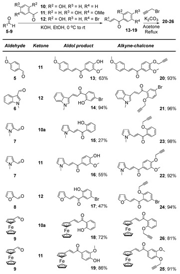 (E)-3-(Ferrocenyl)-1-(4-((1-(2-(4-((E)-3-(2-hydroxyphenyl)-3-oxoprop-1-en-1-yl)phenoxy)ethyl)-1H-1,2,3-triazol-4-yl)methoxy)-3-methoxyphenyl)prop-2-en-1-one (97). A mixture of alkyne chalcone 25 (301 mg, 0.753 mmol), azide chalcone 61 (235 mg, 0.760 mmol), CuSO4·5H2O (225 mg, 0.900 mmol) and sodium ascorbate (398 mg, 2.01 mmol) in t-BuOH/H2O (1:1, 40 mL) was reacted according to GP-A. The crude residue was purified by flash column chromatography (SiO2, 1%–5% MeOH/CH2Cl2) to afford triazole hybrid 97 (427 mg, 80%) as a dark red-brown powdery solid. m.p. 178–180 °C. TLC Rf = 0.28 (2% MeOH/CH2Cl2). IR νmax (neat)/cm−1: 2937w (C-H str), 1740m (C=O str), 1651m, 1637s, 1596s (C=C str), 1571s (C=C str), 1510s (C=C str), 1487m, 1444m, 1341w, 1300m, 1266s, 1203s, 1179s, 1159s, 1146s, 1048m, 1020s. 1H-NMR (500 MHz, CDCl3): δ 3.98 (3H, s, -OCH3), 4.16 (5H, s, -C5H5), 4.42 (2H, t, J = 5.2 Hz, -OCH2CH2N-), 4.47 (2H, t, J = 2.0 Hz, -C5H4), 4.56 (2H, t, J = 2.0 Hz, -C5H4), 4.80 (2H, t, J = 5.2 Hz, -OCH2CH2N-), 5.43 (2H, s, -OCH2CN-), 6.84 (2H, d, J = 8.8 Hz, ArH), 6.97 (1H, t, J = 8.0 Hz, ArH), 7.04 (1H, dd, J = 8.4, 0.8 Hz, ArH), 7.12 (1H, d, J = 15.2 Hz, -CH=CHCO-), 7.12 (1H, d, J = 8.4 Hz, ArH), 7.51 (1H, t, J = 8.4 Hz, ArH), 7.54–7.61 (3H, m, ArH), 7.59 (1H, d, J = 16.0 Hz, -CH=CHCO-), 7.64 (1H, d, J = 1.6 Hz, ArH), 7.74 (1H, d, J = 15.6 Hz, -CH=CHCO-), 7.86 (1H, s, -CHN-), 7.86 (1H, d, J = 15.6 Hz, -CH=CHCO-), 7.97 (1H, dd, J = 8.0, 1.6 Hz, ArH), 12.90 (1H, s, OH). 13C-NMR (500 MHz, CDCl3): δ 49.7, 56.1, 62.8, 66.3, 68.9, 69.7, 71.3, 79.2, 111.1, 112.3, 114.9, 118.3, 118.5, 118.6, 118.8, 120.0, 122.4, 124.3, 128.4, 129.6, 130.6, 132.3, 136.3, 143.8, 144.7, 146.1, 149.5, 151.2, 159.8, 163.6, 187.9, 193.6. LCMS (ES+) m/z = 710.2 ([M + H]+, tR = 2.09 min). HRMS (ESI+) m/z = 710.1889 [M + H]+ found, C40H36N3O6Fe+ required 710.1875.