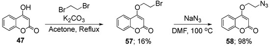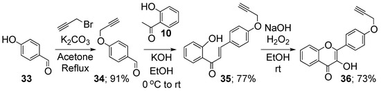 4-((1-(2-(4-(3-Hydroxy-4-oxo-4H-chromen-2-yl)phenoxy)ethyl)-1H-1,2,3-triazol-4-yl)methoxy)-2H-chromen-2-one (127). A mixture of alkyne coumarin 48 (186 mg, 0.931 mmol), azide flavonol 79 (302 mg, 0.933 mmol), CuSO4·5H2O (318 mg, 1.27 mmol) and sodium ascorbate (497 mg, 2.51 mmol) in t-BuOH/H2O (1:1, 40 mL) was reacted according to GP-A. The crude residue was purified by flash column chromatography (SiO2, 1%–5% MeOH/CH2Cl2) and recrystallized from MeOH to afford triazole hybrid 127 (77.9 mg, 16%) as an off-white powdery solid. m.p. 228–230 °C. TLC Rf = 0.46 (5% MeOH/CH2Cl2). IR νmax (neat)/cm−1: 3271w (O-H str), 3015w (C-H str), 2923w (C-H str), 1714s (C=O str), 1622m, 1603s, 1565s (C=C str), 1509m (C=C str), 1480m, 1470w, 1428m, 1406w, 1376w, 1262s, 1228m, 1177m, 1140w, 1106m, 1043m. 1H-NMR (500 MHz, CDCl3): δ 4.52 (2H, t, J = 5.0 Hz, -OCH2CH2N-), 4.89 (2H, t, J = 5.0 Hz, -OCH2CH2N-), 5.37 (2H, s, -OCH2CN-), 5.89 (1H, s, -C=CH), 6.97 (1H, br s, OH), 7.03 (2H, d, J = 9.0 Hz, ArH), 7.24 (1H, t, J = 8.0 Hz, ArH), 7.31 (1H, dd, J = 8.5, 1.0 Hz, ArH), 7.43 (1H, t, J = 8.0 Hz, ArH), 7.54 (1H, t, J = 8.5 Hz, ArH), 7.59 (1H, d, J = 8.5 Hz, ArH), 7.72 (1H, t, J = 8.5 Hz, ArH), 7.78 (1H, dd, J = 8.0, 1.5 Hz, ArH), 7.96 (1H, s, -CHN-), 8.23–8.27 (3H, m, ArH). 13C-NMR (500 MHz, CDCl3): δ 49.9, 62.6, 66.3, 91.2, 114.5, 115.4, 116.8, 118.2, 120.7, 123.1, 123.9, 124.5, 124.7, 124.8, 125.4, 129.7, 132.5, 133.5, 137.8, 141.7, 144.6, 153.3, 155.3, 159.0, 162.6, 164.9, 173.2. LCMS (ES+) m/z = 524.2 ([M + H]+, tR = 1.55 min). HRMS (ESI+) m/z = 524.1476 [M + H]+ found, C29H22N3O7+ required 524.1458.