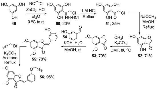 (Z)-2-(4-(2-(4-((3-((4,6-Dimethoxy-3-oxobenzofuran-2(3H)-ylidene)methyl)phenoxy)methyl)-1H-1,2,3-triazol-1-yl)ethoxy)phenyl)-3-hydroxy-7-methoxy-4H-chromen-4-one (123). A mixture of alkyne aurone 56 (192 mg, 0.571 mmol), azide flavonol 80 (210 mg, 0.595 mmol), CuSO4·5H2O (234 mg, 0.939 mmol) and sodium ascorbate (362 mg, 1.83 mmol) in t-BuOH/H2O (1:1, 40 mL) was reacted according to GP-A. The crude residue was purified by flash column chromatography (SiO2, 1%–5% MeOH/CH2Cl2) and recrystallized from MeOH to afford triazole hybrid 123 (54.3 mg, 14%) as a pale yellow-brown powdery solid. m.p. 178–180 °C. TLC Rf = 0.29 (5% MeOH/CH2Cl2). IR νmax (neat)/cm−1: 3302w (O-H str), 2939w (C-H str), 2845w (C-H str), 1692w, 1614s (C=O str), 1599s (C=C str), 1510m (C=C str), 1503m (C=C str), 1452m, 1403w, 1361w, 1346w, 1251m, 1215s, 1187w, 1156m, 1121w, 1092s, 1036w. 1H-NMR (500 MHz, CDCl3): δ 3.91 (3H, s, -OCH3), 3.92 (3H, s, -OCH3), 3.95 (3H, s, -OCH3), 4.46 (2H, t, J = 4.5 Hz, -OCH2CH2N-), 4.83 (2H, t, J = 4.5 Hz, -OCH2CH2N-), 5.34 (2H, s, -OCH2CN-), 6.08 (1H, s, ArH), 6.41 (1H, s, ArH), 6.70 (1H, s, -C=CH), 6.93–6.95 (4H, m, ArH and OH), 6.99–7.03 (2H, m, ArH), 7.34 (1H, t, J = 8.0 Hz, ArH), 7.40 (1H, d, J = 7.5 Hz, ArH), 7.55 (1H, s, ArH), 7.85 (1H, br s, -CHN-), 8.12 (1H, d, J = 9.0 Hz, ArH), 8.16 (2H, d, J = 8.5 Hz, ArH). 13C-NMR (500 MHz, CDCl3): δ 49.8, 55.9, 56.2, 56.2, 62.2, 66.4, 89.3, 94.1, 99.9, 105.1, 110.3, 114.4, 114.6, 114.8, 116.2, 116.7, 121.9, 123.9, 124.5, 124.8, 126.7, 129.3, 129.8, 134.0, 137.4, 144.0, 148.0, 157.2, 158.3, 158.8, 159.3, 164.2, 169.1, 172.6, 180.6. LCMS (ES+) m/z = 690.2 ([M + H]+, tR = 4.59 min). HRMS (ESI+) m/z = 690.2062 [M + H]+ found, C38H32O10N3+ required 690.2082.