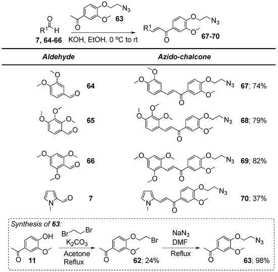 6-Methoxy-2-((Z)-4-(2-(4-((2-methoxy-5-((E)-3-(1-methyl-1H-pyrrol-2-yl)acryloyl)phenoxy)methyl)-1H-1,2,3-triazol-1-yl)ethoxy)benzylidene)benzofuran-3(2H)-one (118). A mixture of alkyne chalcone 22 (265 mg, 0.898 mmol), azide aurone 89 (304 mg, 0.900 mmol), CuSO4·5H2O (264 mg, 1.06 mmol) and sodium ascorbate (474 mg, 2.39 mmol) in t-BuOH/H2O (1:1, 40 mL) was reacted according to GP-A. The crude residue was purified by flash column chromatography (SiO2, 1%–5% MeOH/CH2Cl2) to afford triazole hybrid 118 (270 mg, 48%) as a bright yellow powdery solid. m.p. 138–140 °C. TLC Rf = 0.46 (5% MeOH/CH2Cl2). IR νmax (neat)/cm−1: 2934w (C-H str), 2884w (C-H str), 1700m (C=O str), 1656m, 1638m, 1596s (C=C str), 1562s (C=C str), 1510m (C=C str), 1483m, 1412m, 1330m, 1267s, 1198m, 1152s, 1132s, 1099s, 1056m, 1042s, 1022s. 1H-NMR (500 MHz, CDCl3): δ 3.74 (3H, s, -NCH3), 3.94 (3H, s, -OCH3), 3.96 (3H, s, -OCH3), 4.42 (2H, t, J = 4.8 Hz, -OCH2CH2N-), 4.79 (2H, t, J = 4.8 Hz, -OCH2CH2N-), 5.41 (2H, s, -OCH2CN-), 6.19–6.21 (1H, m, ArH), 6.74–6.80 (4H, m, ArH), 6.78 (1H, s, -C=CH), 6.87 (2H, d, J = 8.8 Hz, ArH), 7.11 (1H, d, J = 8.4 Hz, ArH), 7.27 (1H, d, J = 15.2 Hz, -CH=CHCO-, overlain by CDCl3), 7.58 (1H, dd, J = 8.4, 1.6 Hz, ArH), 7.64 (1H, d, J = 2.0 Hz, ArH), 7.69 (1H, d, J = 8.8 Hz, ArH), 7.78 (1H, d, J = 15.2 Hz, -CH=CHCO-), 7.82 (2H, d, J = 8.8 Hz, ArH), 7.87 (1H, s, -CHN-). 13C-NMR (500 MHz, CDCl3): δ 34.3, 49.7, 56.0, 56.0, 62.8, 66.2, 96.6, 109.6, 111.0, 111.4, 112.0, 112.1, 112.3, 114.8, 114.9, 116.2, 122.3, 124.3, 125.6, 126.1, 127.6, 130.2, 131.6, 132.4, 133.1, 143.8, 147.0, 149.4, 151.2, 158.6, 167.2, 168.2, 182.8, 188.0. LCMS (ES+) m/z = 633.3 ([M + H]+, tR = 1.94 min). HRMS (ESI+) m/z = 633.2352 [M + H]+ found, C36H33N4O7+ required 633.2349.