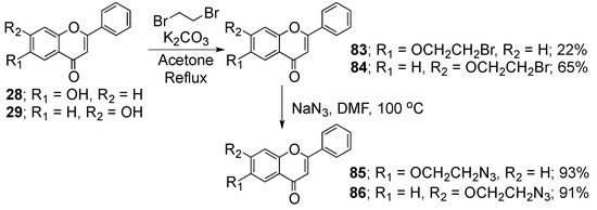 6-(2-(4-(((4-Oxo-2-phenyl-4H-chromen-3-yl)oxy)methyl)-1H-1,2,3-triazol-1-yl)ethoxy)-2-phenyl-4H-chromen-4-one (109). A mixture of alkyne flavone 30 (277 mg, 1.00 mmol), azide flavone 85 (307 mg, 0.998 mmol), CuSO4·5H2O (303 mg, 1.21 mmol) and sodium ascorbate (492 mg, 2.48 mmol) in t-BuOH/H2O (1:1, 40 mL) was reacted according to GP-A. The crude residue was purified by flash column chromatography (SiO2, 1%–5% MeOH/CH2Cl2) to afford triazole hybrid 109 (534 mg, 92%) as a white powdery solid. m.p. 234–236 °C. TLC Rf = 0.36 (5% MeOH/CH2Cl2). IR νmax (neat)/cm−1: 3145w (C-H str), 2940w (C-H str), 1736w, 1643s (C=O str), 1627s, 1600m, 1570m (C=C str), 1561m (C=C str), 1482m, 1470m, 1455s, 1398m, 1361s, 1293m, 1197s, 1187m, 1148m, 1087m, 1047m, 1026w. 1H-NMR (500 MHz, CDCl3): δ 4.41 (2H, t, J = 4.8 Hz, -OCH2CH2N-), 4.73 (2H, t, J = 4.8 Hz, -OCH2CH2N-), 5.34 (2H, s, -OCH2CN-), 6.83 (1H, s, -C=CH), 7.25 (1H, dd, J = 9.2, 3.2 Hz, ArH, overlain by CDCl3), 7.41–7.46 (4H, m, ArH), 7.51–7.55 (5H, m, ArH), 7.58 (1H, d, J = 3.2 Hz, ArH), 7.70 (1H, t, J = 7.2 Hz, ArH), 7.81 (1H, s, -CHN-), 7.92–7.94 (2H, m, ArH), 8.01–8.04 (2H, m, ArH), 8.29 (1H, d, J = 7.2 Hz, ArH). 13C-NMR (500 MHz, CDCl3): δ 49.4, 65.1, 66.7, 105.9, 106.9, 118.0, 119.9, 123.8, 124.1, 124.5, 124.8, 125.7, 126.2, 128.3, 128.7, 129.0, 130.7, 131.6, 131.7, 133.5, 139.5, 144.0, 151.4, 155.1, 155.3, 156.4, 163.3, 175.1, 178.0. LCMS (ES+) m/z = 584.1 ([M + H]+, tR = 1.91 min). HRMS (ESI+) m/z = 606.1610 [M + Na]+ found, C35H25O6N3Na+ required 606.1636.