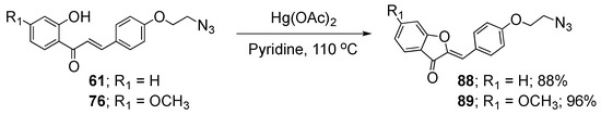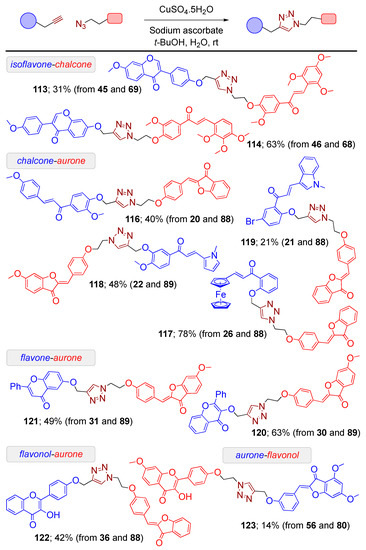 2-((Z)-4-(2-(4-((2-Methoxy-4-((E)-3-(4-methoxyphenyl)acryloyl)phenoxy)methyl)-1H-1,2,3-triazol-1-yl)-ethoxy)benzylidene)benzofuran-3(2H)-one (116). A mixture of alkyne chalcone 20 (192 mg, 0.595 mmol), azide aurone 88 (187 mg, 0.609 mmol), CuSO4·5H2O (289 mg, 1.16 mmol) and sodium ascorbate (548 mg, 2.77 mmol) in t-BuOH/H2O (1:1, 40 mL) was reacted according to GP-A. The crude residue was purified by flash column chromatography (SiO2, 1%–5% MeOH/CH2Cl2) and recrystallized from MeOH to afford triazole hybrid 116 (148 mg, 40%) as a bright yellow powdery solid. m.p. 128–130 °C. TLC Rf = 0.33 (3% MeOH/CH2Cl2). IR νmax (neat)/cm−1: 2941w (C-H str), 2835w (C-H str), 1695m (C=O str), 1647m, 1590s (C=C str), 1571s (C=C str), 1509s (C=C str), 1461m, 1422m, 1296m, 1250s, 1174s, 1147s, 1128s, 1110s, 1098m, 1025s. 1H-NMR (500 MHz, CDCl3): δ 3.85 (3H, s, -OCH3), 3.97 (3H, s, -OCH3), 4.43 (2H, t, J = 5.0 Hz, -OCH2CH2N-), 4.80 (2H, t, J = 5.0 Hz, -OCH2CH2N-), 5.42 (2H, s, -OCH2CN-), 6.83 (1H, s, -C=CH), 6.89 (2H, d, J = 9.0 Hz, ArH), 6.91 (2H, d, J = 9.0 Hz, ArH), 7.12 (1H, d, J = 8.0 Hz, ArH), 7.22 (1H, t, J = 8.0 Hz, ArH), 7.33 (1H, d, J = 8.0 Hz, ArH), 7.39 (1H, d, J = 15.5 Hz, -CH=CHCO-), 7.56 (2H, d, J = 8.5 Hz, ArH), 7.60 (1H, dd, J = 8.5, 2.0 Hz, ArH), 7.64–7.67 (2H, m, ArH), 7.77 (1H, d, J = 16.0 Hz, -CH=CHCO-), 7.79–7.81 (1H, m, ArH), 7.86 (2H, d, J = 9.0 Hz, ArH), 7.87 (1H, br s, -CHN-). 13C-NMR (500 MHz, CDCl3): δ 49.7, 55.4, 56.1, 62.9, 66.3, 111.1, 112.3, 112.6, 112.9, 114.3, 114.9, 119.1, 121.8, 122.6, 123.3, 124.3, 124.6, 126.1, 127.7, 130.1, 132.2, 133.1, 133.4, 136.6, 144.0, 146.1, 149.6, 151.4, 158.9, 161.5, 165.9, 184.5, 188.6. LCMS (ES+) m/z = 630.0 ([M + H]+, tR = 1.72 min). HRMS (ESI+) m/z = 630.2217 [M + H]+ found, C37H32O7N3+ required 630.2235.