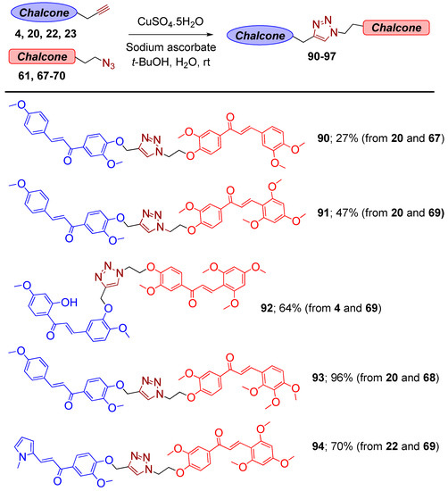 (E)-3-(3,4-Dimethoxyphenyl)-1-(3-methoxy-4-(2-(4-((2-methoxy-4-((E)-3-(4-methoxyphenyl)acryloyl))methyl)-1H-1,2,3-triazol-1-yl)ethoxy)phenyl)prop-2-en-1-one (90). A mixture of alkyne chalcone 20 (254 mg, 0.789 mmol), azide chalcone 67 (305 mg, 0.796 mmol), CuSO4·5H2O (225 mg, 0.900 mmol) and sodium ascorbate (389 mg, 1.97 mmol) in t-BuOH/H2O (1:1, 40 mL) was reacted according to GP-A. The crude residue was purified by flash column chromatography (SiO2, 1%–5% MeOH/CH2Cl2) and recrystallized from MeOH to afford triazole hybrid 90 (151 mg, 27%) as a pale yellow-brown powdery solid. m.p. 108–110 °C. TLC Rf = 0.41 (5% MeOH/CH2Cl2). IR νmax (neat)/cm−1: 2942w (C-H str), 2837w (C-H str), 1652m (C=O str), 1595m (C=C str), 1572m (C=C str), 1509s (C=C str), 1464m, 1420m, 1335w, 1307w, 1255s, 1195w, 1143s, 1021s. 1H-NMR (500 MHz, CDCl3): δ 3.86 (3H, s, -OCH3), 3.92 (3H, s, -OCH3), 3.94 (3H, s, -OCH3), 3.95 (3H, s, -OCH3), 3.96 (3H, s, -OCH3), 4.46 (2H, t, J = 5.2 Hz, -OCH2CH2N-), 4.84 (2H, t, J = 5.2 Hz, -OCH2CH2N-), 5.40 (2H, s, -OCH2CN-), 6.82 (1H, d, J = 8.0 Hz, ArH), 6.90 (1H, d, J = 8.4 Hz, ArH), 6.93 (2H, d, J = 8.8 Hz, ArH), 7.14–7.17 (2H, m, ArH), 7.24 (1H, dd, J = 8.4, 2.0 Hz, ArH), 7.37 (1H, d, J = 15.2 Hz, -CH=CHCO-), 7.41 (1H, d, J = 15.6 Hz, -CH=CHCO-), 7.57–7.62 (6H, m, ArH), 7.75 (1H, d, J = 15.6 Hz, -CH=CHCO-), 7.77 (1H, d, J = 15.6 Hz, -CH=CHCO-), 8.04 (1H, s, -CHN-). 13C-NMR (500 MHz, CDCl3): δ 49.8, 55.4, 56.0, 56.0, 62.9, 67.6, 110.2, 111.1, 111.1, 111.5, 112.3, 112.4, 114.4, 119.2, 119.4, 122.5, 122.6, 123.0, 124.7, 127.7, 127.9, 130.1, 132.1, 132.8, 143.7, 144.0, 144.5, 149.2, 149.5, 149.7, 151.2, 151.4, 151.6, 161.5, 188.6. LCMS (ES+) m/z = 706.2 ([M + H]+, tR = 1.65 min). HRMS (ESI+) m/z = 728.2576 [M + Na]+ found, C40H39O9N3Na+ required 728.2579.