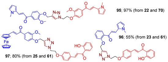 (E)-1-(3-Methoxy-4-((1-(2-(2-methoxy-4-((E)-3-(1-methyl-1H-pyrrol-2-yl)acryloyl)phenoxy)ethyl)-1H-1,2,3-triazol-4-yl)methoxy)phenyl)-3-(1-methyl-1H-pyrrol-2-yl)prop-2-en-1-one (95). A mixture of alkyne chalcone 22 (271 mg, 0.918 mmol), azide chalcone 70 (301 mg, 0.924 mmol), CuSO4·5H2O (316 g, 1.26 mmol) and sodium ascorbate (499 mg, 2.52 mmol) in t-BuOH/H2O (1:1, 40 mL) was reacted according to GP-A. The crude residue was purified by flash column chromatography (SiO2, 1%–5% MeOH/CH2Cl2) and recrystallized from MeOH to afford triazole hybrid 95 (555 mg, 97%) as a dark yellow-brown flaky solid. m.p. 118–120 °C. TLC Rf = 0.38 (5% MeOH/CH2Cl2). IR νmax (neat)/cm−1: 2941w (C-H str), 2844w (C-H str), 1644m (C=O str), 1594m (C=C str), 1564s (C=C str), 1511m (C=C str), 1480m, 1412m, 1381w, 1330m, 1258s, 1196m, 1153s, 1129m, 1055w, 1025m. 1H-NMR (500 MHz, CDCl3): δ 3.76 (3H, s, -NCH3), 3.77 (3H, s, -NCH3), 3.92 (3H, s, -OCH3), 3.95 (3H, s, -OCH3), 4.46 (2H, t, J = 4.8 Hz, -OCH2CH2N-), 4.84 (2H, t, J = 4.8 Hz, -OCH2CH2N-), 5.39 (2H, s, -OCH2CN-), 6.22–6.24 (2H, m, ArH), 6.82–6.86 (5H, m, ArH), 7.15 (1H, d, J = 8.0 Hz, ArH), 7.27 (1H, d, J = 15.2 Hz, -CH=CHCO-, overlain by CDCl3), 7.29 (1H, d, J = 14.0 Hz, -CH=CHCO-), 7.57–7.62 (4H, m, ArH), 7.79 (2H, d, J = 14.8 Hz, 2 × -CH=CHCO-), 8.04 (1H, s, -CHN-). 13C-NMR (500 MHz, CDCl3): δ 34.4, 49.7, 55.9, 56.0, 62.9, 67.5, 109.6, 109.7, 111.1, 111.4, 112.1, 112.2, 112.3, 112.4, 116.2, 116.3, 122.1, 122.3, 124.7, 127.6, 127.7, 130.3, 130.3, 131.6, 131.8, 132.4, 133.1, 143.7, 149.4, 149.6, 150.9, 151.4, 188.0, 188.1. LCMS (ES+) m/z = 622.3 ([M + H]+, tR = 1.62 min). HRMS (ESI+) m/z = 622.2648 [M + H]+ found, C35H36O6N5+ required 622.2660.