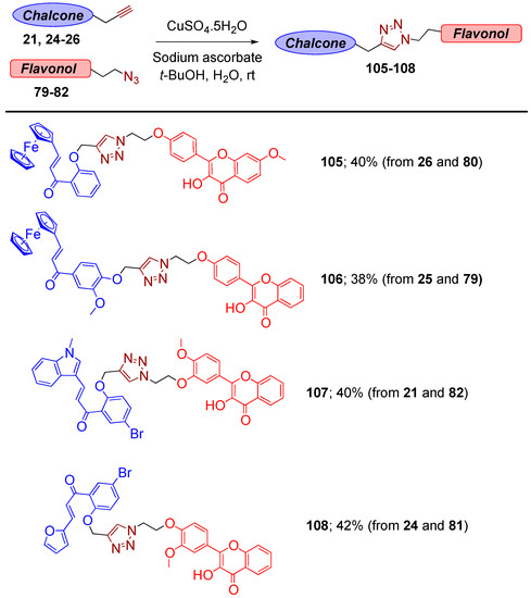 (E)-2-(4-(2-(4-((2-(3-(Ferrocenyl)acryloyl)phenoxy)methyl)-1H-1,2,3-triazol-1-yl)ethoxy)phenyl)-3-hydroxy-7-methoxy-4H-chromen-4-one (105). A mixture of alkyne chalcone 26 (310 mg, 0.838 mmol), azide flavonol 80 (296 mg, 0.838 mmol), CuSO4·5H2O (273 mg, 1.09 mmol) and sodium ascorbate (496 mg, 2.50 mmol) in t-BuOH/H2O (1:1, 40 mL) was reacted according to GP-A. The crude residue was purified by flash column chromatography (SiO2, 1%–5% MeOH/CH2Cl2) to afford triazole hybrid 105 (238 mg, 40%) as a dark red powdery solid. m.p. 118–120 °C. TLC Rf = 0.44 (5% MeOH/CH2Cl2). IR νmax (neat)/cm−1: 3340w (O-H str), 3088w (C-H str), 2929w (C-H str), 1735m (C=O str), 1597s (C=C str), 1541m (C=C str), 1506m (C=C str), 1484m, 1449m, 1403m, 1235s, 1206s, 1171s, 1117m, 1106m, 1044w, 1025s. 1H-NMR (500 MHz, CDCl3): δ 3.96 (3H, s, -OCH3), 4.12 (5H, s, -C5H5), 4.35 (2H, t, J = 4.5 Hz, -OCH2CH2N-), 4.43 (2H, t, J = 1.5 Hz, -C5H4), 4.48 (2H, t, J = 1.5 Hz, -C5H4), 4.67 (2H, t, J = 5.0 Hz, -OCH2CH2N-), 5.33 (2H, br s, -OCH2CN-), 6.95–6.97 (4H, m, ArH and OH), 6.96 (1H, d, J = 15.5 Hz, -CH=CHCO-), 7.01 (1H, dd, J = 9.0, 2.0 Hz, ArH), 7.09 (1H, t, J = 7.5 Hz, ArH), 7.14 (1H, d, J = 8.5 Hz, ArH), 7.46 (1H, dd, J = 7.5, 1.0 Hz, ArH), 7.50 (1H, d, J = 16.0 Hz, -CH=CHCO-), 7.60 (1H, dd, J = 7.5, 1.5 Hz, ArH), 7.77 (1H, br s, -CHN-), 8.14 (1H, d, J = 9.0 Hz, ArH), 8.19 (2H, d, J = 8.5 Hz, ArH). 13C-NMR (500 MHz, CDCl3): δ 49.6, 55.8, 63.0, 66.1, 68.9, 69.8, 71.3, 79.0, 99.9, 113.1, 114.5, 114.6, 114.7, 121.4, 124.0, 124.7, 126.7, 129.3, 130.1, 130.2, 132.4, 137.4, 144.1, 145.5, 156.3, 157.2, 158.8, 164.2, 172.6, 192.3. LCMS (ES+) m/z = 724.2 ([M + H]+, tR = 2.01 min). HRMS (ESI+) m/z = 724.1711 [M + H]+ found, C40H34N3O7Fe+ required 724.1746.