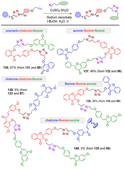 2-(4-(2-(4-((4-((E)-3-(Ferrocenyl)acryloyl)-2-methoxyphenoxy)methyl)-1H-1,2,3-triazol-1-yl)ethoxy)phenyl)-3-((1-(2-(4-(((Z)-6-methoxy-3-oxobenzofuran-2(3H)-ylidene)methyl)phenoxy)ethyl)-1H-1,2,3-triazol-4-yl)methoxy)-4H-chromen-4-one (140). A mixture of alkyne biflavonoid 135 (71.6 mg, 0.0940 mmol), azide aurone 89 (38.1 mg, 0.113 mmol), CuSO4·5H2O (46.1 mg, 0.185 mmol) and sodium ascorbate (58.0 mg, 0.293 mmol) in t-BuOH/H2O (1:1, 40 mL) was reacted according to GP-A. The crude residue was purified by flash column chromatography (SiO2, 1%–5% MeOH/CH2Cl2) and further purified by preparative HPLC to afford triazole hybrid 140 (2.80 mg, 3%) as a bright red powdery solid. m.p. 158–160 °C. TLC Rf = 0.35 (7% MeOH/CH2Cl2). IR νmax (neat)/cm−1: 2917w (C-H str), 2852w (C-H str), 1737w, 1605s (C=O str), 1509m (C=C str), 1465m, 1443w, 1378w, 1353w, 1260s, 1198m, 1151m, 1133w, 1113w, 1042w, 1015w. 1H-NMR (500 MHz, CDCl3): δ 3.94 (3H, s, -OCH3), 3.96 (3H, s, -OCH3), 4.17 (5H, br s, -C5H5), 4.38 (2H, t, J = 5.0 Hz, -OCH2CH2N-), 4.42 (2H, t, J = 5.0 Hz, -OCH2CH2N-), 4.47 (2H, br s, -C5H4), 4.57 (2H, br s, -C5H4), 4.73 (2H, t, J = 5.0 Hz, -OCH2CH2N-), 4.80 (2H, t, J = 4.5 Hz, -OCH2CH2N-), 5.30 (2H, s, -OCH2CN-), 5.41 (2H, s, -OCH2CN-), 6.76–6.79 (2H, m, ArH and -C=CH), 6.77 (1H, d, J = 14.5 Hz, -CH=CHCO-), 6.89 (2H, d, J = 9.0 Hz, ArH), 6.90 (2H, d, J = 8.5 Hz, ArH), 7.14 (1H, d, J = 8.0 Hz, ArH), 7.43 (1H, t, J = 8.0 Hz, ArH), 7.53 (1H, d, J = 8.5 Hz, ArH), 7.58 (1H, d, J = 8.2 Hz, ArH), 7.62 (1H, s, ArH), 7.70 (1H, t, J = 8.5 Hz, ArH), 7.70 (1H, d, J = 16.0 Hz, -CH=CHCO-), 7.71 (2H, d, J = 8.5 Hz, ArH), 7.84 (2H, d, J = 9.0 Hz, ArH), 7.89 (1H, s, -CHN-), 7.94 (1H, s, -CHN-), 8.05 (2H, d, J = 9.0 Hz, ArH), 8.27 (1H, dd, J = 8.0, 1.5 Hz, ArH). 13C-NMR (500 MHz, CDCl3): δ 49.6, 49.7, 56.1, 61.2, 62.8, 66.2, 66.3, 68.9, 69.8, 71.3, 79.3, 96.6, 111.2, 111.6, 111.8, 112.1, 112.3, 114.3, 114.3, 114.9, 118.0, 118.6, 121.3, 122.5, 122.5, 124.1, 124.1, 124.3, 124.4, 124.8, 125.1, 125.7, 125.7, 125.8, 130.6, 133.0, 133.2, 133.5, 138.3, 144.0, 146.0, 149.6, 151.4, 155.1, 157.4, 158.8, 159.5, 167.5, 167.7, 179.2, 182.9, 187.9. LCMS (ES+) m/z = 1098.8 ([M + H]+, tR = 2.02 min). HRMS (ESI+) m/z = 1099.2960 [M + H]+ found, C61H51FeN6O11+ required 1099.2921.
