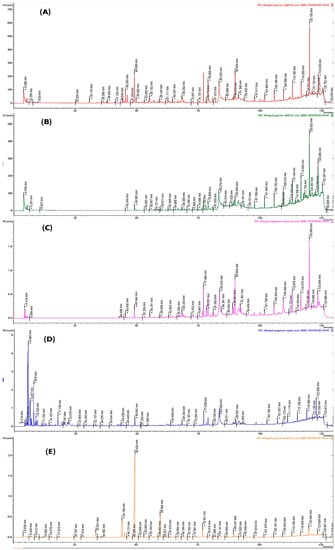 The Gas Chromatography (GC) profile of P. harmala essential oil from Algeria (A); Egypt (B); Libya (C); Morocco (D) and Tunisia (E).