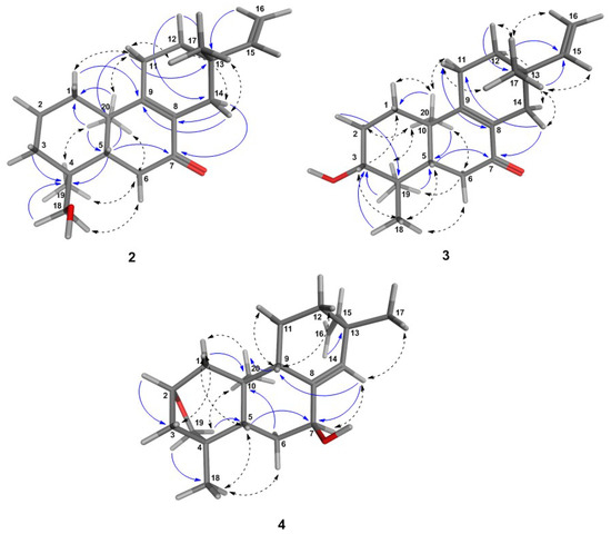 3D-structures of the most energetically-favorable conformers for the ent-pimaranes 2–4 obtained after a low mode molecular dynamics (LMD) conformation search. Distances (≤3.0 Å) between the protons in the molecular model were in agreement with the experimental NOE effects, as shown by the NOESY correlations (dashed arrows). HMBC key correlations are also shown (blue arrows).