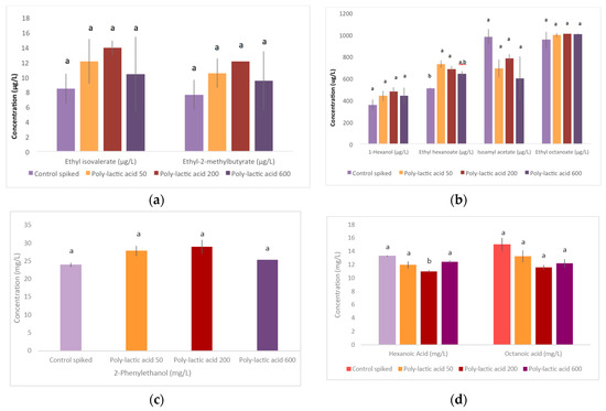 | Polylactic acid 200 | 2.89 a,b | 11.35 | 6.14 a,b | 0.85 | 0.30 | 50.85 b |