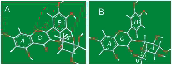 Flavonoid glycosides can be found in a wide range of plants, especially those used in Chinese herbal medicines, and have been reported to exhibit remarkable antioxidant effects [1]. The glycosyl groups found in flavonoid glycosides are usually hexanoses, which are preferentially condensed in their six-membered (pyranosyl) ring forms. Among these pyranosyl rings, the glucopyranosyl and rhamnopyranosyl systems are regarded as two typical rings [2,3], because of their chemical stability. Flavonoid glucosides and flavonoid rhamnosides are therefore two of the most common members of the flavonoid glycoside family and can be found in a wide range of plants. For example, quercitrin (quercetin-3-O-rhamnoside, Figure 1A and Video S1) has been isolated from seven Loranthaceae plants [4], whereas isoquercitrin (quercetin-3-O-glucoside, Q3G, Figure 1B and Video S2) has been reported to be widely distributed in several Moraceae plants [5]. Furthermore, quercitrin and isoquercitrin have been reported to co-exist in several medicinal plants, including Hypericum japonicum [6], Amomum villosum [7], and Polygonum hydropiper [8].