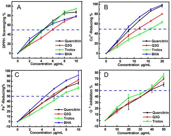 Dose-response curves of quercitrin and isoquercitrin (Q3G) in various antioxidant assays: (A) DPPH•-scavenging assay; (B) Cu2+ reducing power assay; (C) FRAP assay (Fe3+ reducing); (D) •O2−-scavenging assay. Each value is expressed as mean ± SD, n = 3. Trolox and BHA are used as the positive controls.