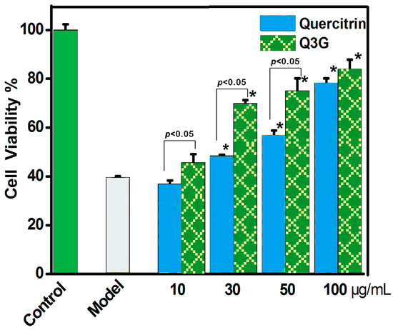 Protective effects of quercitrin and isoquercitrin against the Fenton reagent-induced damage of MSCs using an 3-(4,5-dimethylthiazol-2-yl)-2,5-diphenyl (MTT) assay. The Fenton reagent (FeCl2 plus H2O2) was used to generate •OH radicals. These data represent the mean ± SD (n = 3). * p < 0.05 vs. model.