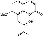 Auraptenol (8-(2-hydroxy-3-methylbut-3-enyl)-7-methoxychromen-2-one) is a phytochemical isolated from Angelicae dahuricae radix. The root of the plant is used to treat harmful exterior stimuli on the skin, such as dryness, dampness, heat, and cold in Oriental medicine [53]. It has been shown that its antinociceptive effects are linked to the facilitated release of endogenous opioids [54] and that a single oral administration of A. dahuricae (3.25 g or 6.5 g) decreased cold-induced tonic pain in a dose-dependent manner in clinical trials [55]. It reverted mechanical hyperalgesia induced by vincristine through 5-HT1A receptors in a dose-dependent manner (within the 0.05–0.8 mg/kg range). The highest dose of auraptenol (0.8 mg/kg, i.p.) totally suppressed the mechanical hyperalgesia without affecting the general locomotor activity [22].