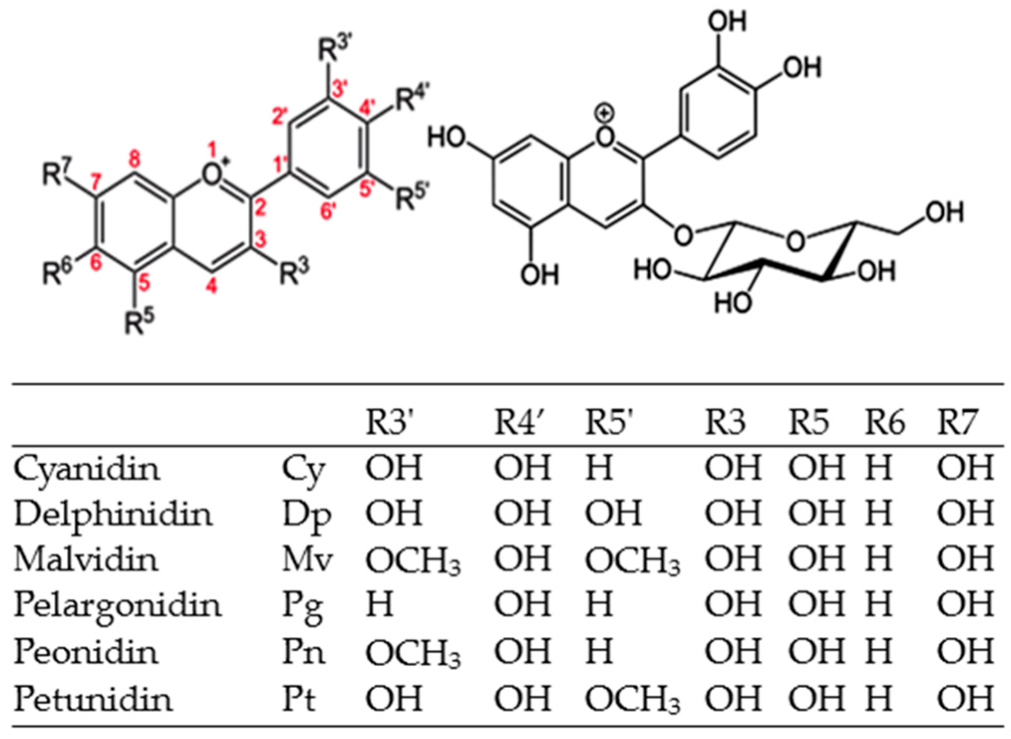 The color of ACNs-rich fruits is a matter of quantity (biosynthesis), molecular inter-play and physicochemical stability. In particular, production and stability of red Cy3G in plants has been extensively studied in horticultural sciences, an aspect that will be further discussed in this article. Many structural features, such as the number of hydroxyl groups, their degree of methylation and the nature and number of sugar moieties bound to the molecule, are related to the color of ACNs. In nature, ACNs show great color diversity from yellow (480 nm) to red (730 nm), and, particularly, Cy3G confers a red hue to fruits [27]. However, the maximum absorption [λmax (εmol) nm] of its flavylium (2-phenyl-1-benzopyrilium) nucleus [10] is more restricted to the six most common aglycones and is related to their B-ring hydroxylation pattern: Cy and Pn (516 nm), Pg (520 nm), and Dp, Pt, Mv (546 nm).