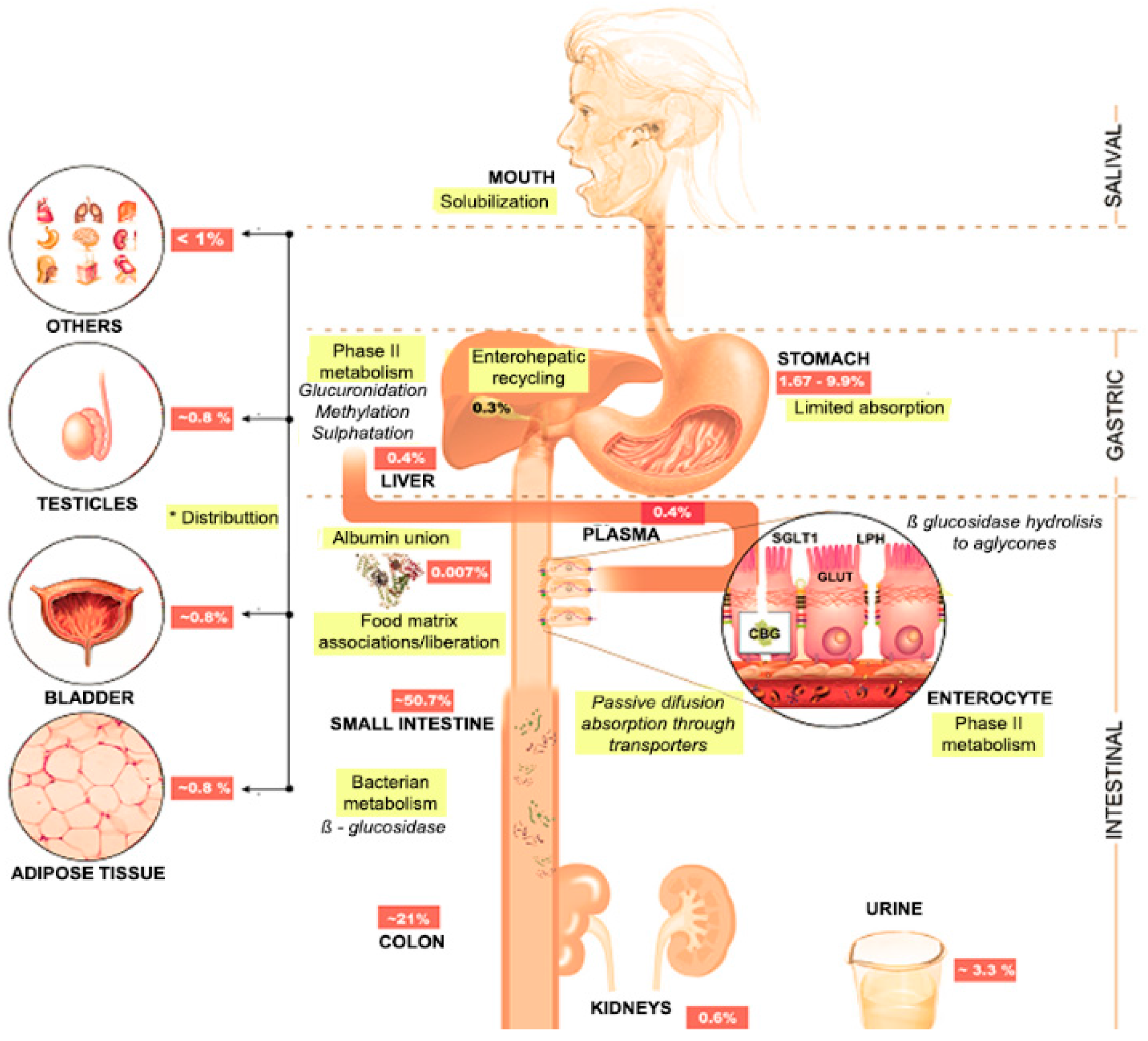 The third moment on Cy3G metabolism is within the small bowel. Unlike gastric conditions, the physical and chemical microenvironment in the small intestine reduces Cy3G’s bioavailability by 40–50% (Figure 3). Studies performed in mice [28], humans [14,26] and rats [12,93] confirm this finding. Factors such as pH, Cy3G’s releasability from the food matrix, pancreatic and brush border enzyme action, transportation mechanisms and enterocyte’s phase I/II metabolism, are responsible for the bioavailability of Cy3G, Cy and their metabolites (degradation products or phase II metabolites). At intestinal pH (8.2 ± 0.2) Cy3G returns to its quinoidal form (negatively charged and highly unstable) while its glucose moiety remains neutral. Also, uncertain factors/enzymes perform the further de-glucosylation of Cy3G since lactase-phlorizin hydrolase (LPH; EC 3.2.1.62) or cytosolic β-glucosidases do not seem to participate [12]; however, other authors still consider the action of LPH on Cy3G molecule [94]. Nevertheless, it is noteworthy that the cleavage of its glucose moiety is not a prerequisite for Cy3G chemical breakdown and splanchnic metabolism [93,95] although it is an important mediator of its trans-epithelial transport [27].
