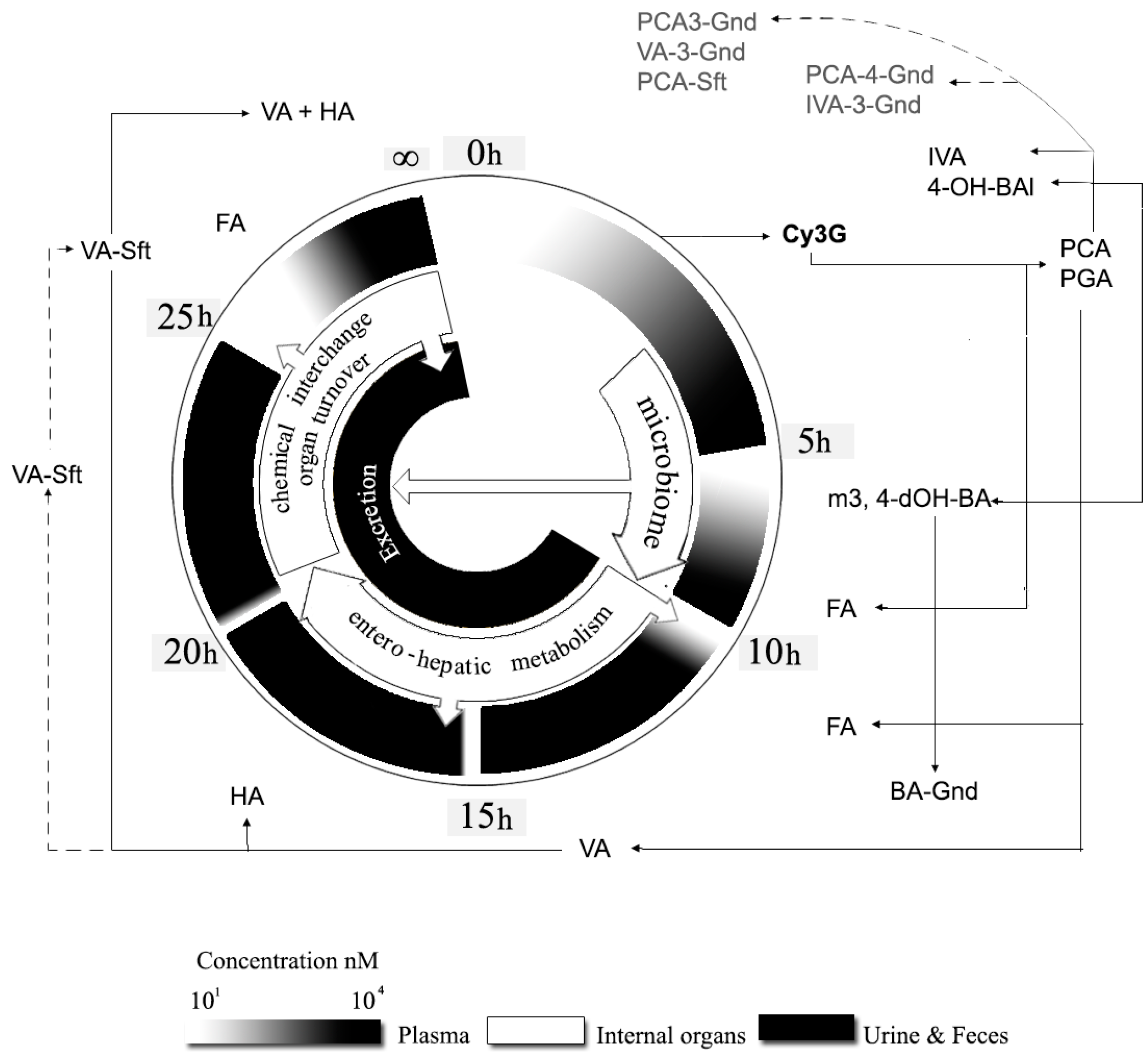 Time-course bioavailability of Cy3G and its main metabolites. Note: The absorption and biotransformation of cyanidin-3-O-glucoside (Cy3G) into derivates and metabolites are depicted clockwise in this figure and explained in detail within the text. See abbreviations section for the meaning of terms.