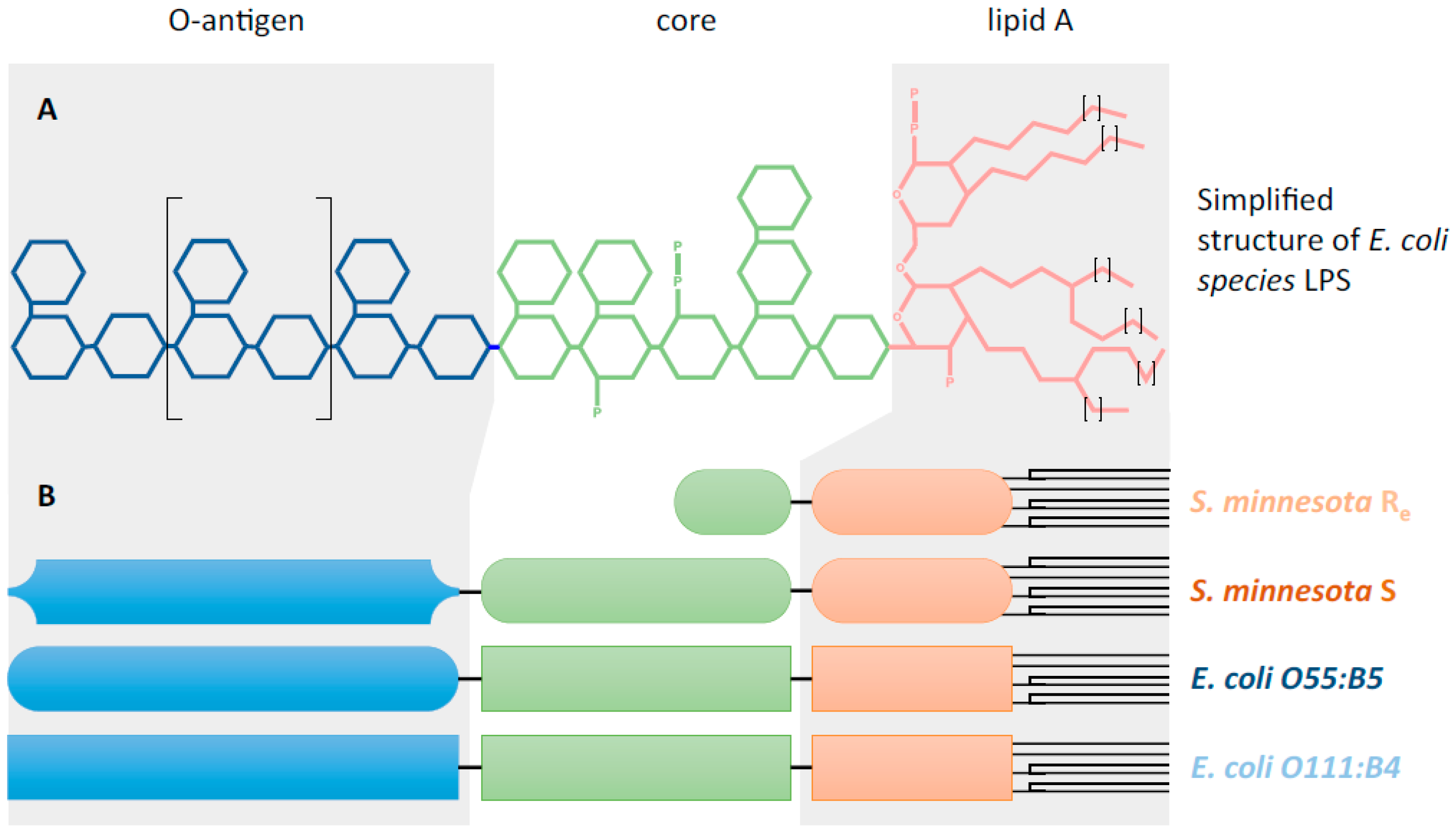 Structure of lipopolysaccharides. (A) Simplified structure of E. coli species LPS. LPS consist of three parts: (i) Lipid A, composed of two β1-6-linked N-acetylglucosamines (GlcNAc) substituted with six fatty acids (with chain length ranging from C12 to C16, buried in the bacterial outer membrane, marked with small brackets) as ether amino or hydoxyl linkage and with phosphate esters (“P”). Lipid A structure varies between bacterial strains in terms of fatty acids chain number, composition, phosphorylation and amination (not shown); (ii) the core, a polysaccharide moiety (composed of 3-deoxy-d-mannooctulosonic acid, heptose, glucose, galactose and GlcNAc with possible phosphorylation and amination), is linked to the lipid A; (iii) the O-antigen, composed of repetitive units of polysaccharides, defines the serotype of bacterial strains and can be composed of glucose, galactose, rhamnose, mannose or abequose. (B) Schematic structures of LPS used in this study. Selected LPS show different lengths or composition. Two LPS from Salmonella minnesota strains (S. minnesota) were used, one corresponds to the long form issued from the smooth strain (S); and the second one results from defects in LPS biosynthesis leading to truncated “rough” LPS chemotype, with the absence of O-antigen and a shortened core (Re form) (Huang et al., 2012). E. coli LPS differ in the O-antigen composition.