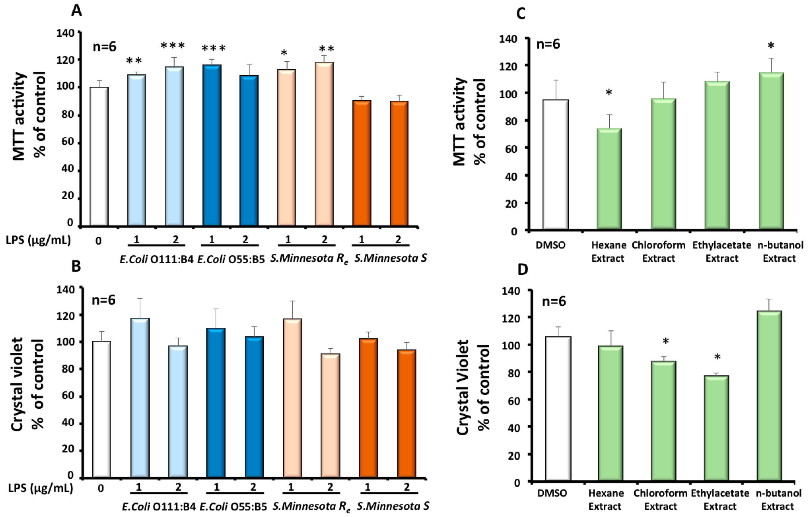 Effect of LPS or cactus extracts on viability (MTT assay; A and C respectively) and on cell growth (crystal violet assay; B and D respectively) of BV-2 microglial cells. Cells were treated for 24 h with the four different serotypes of LPS (1 or 2 µg/mL) or the four cactus extracts (100 µg/mL). The results were the mean ± SD of the three independent experiments. Values were normalized to the control and are given as percent of the control. The significance is shown with the Student-t test: p < 0.05 for *; p < 0.01 for **; p < 0.001 for ***.