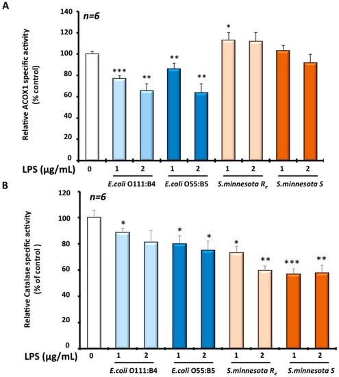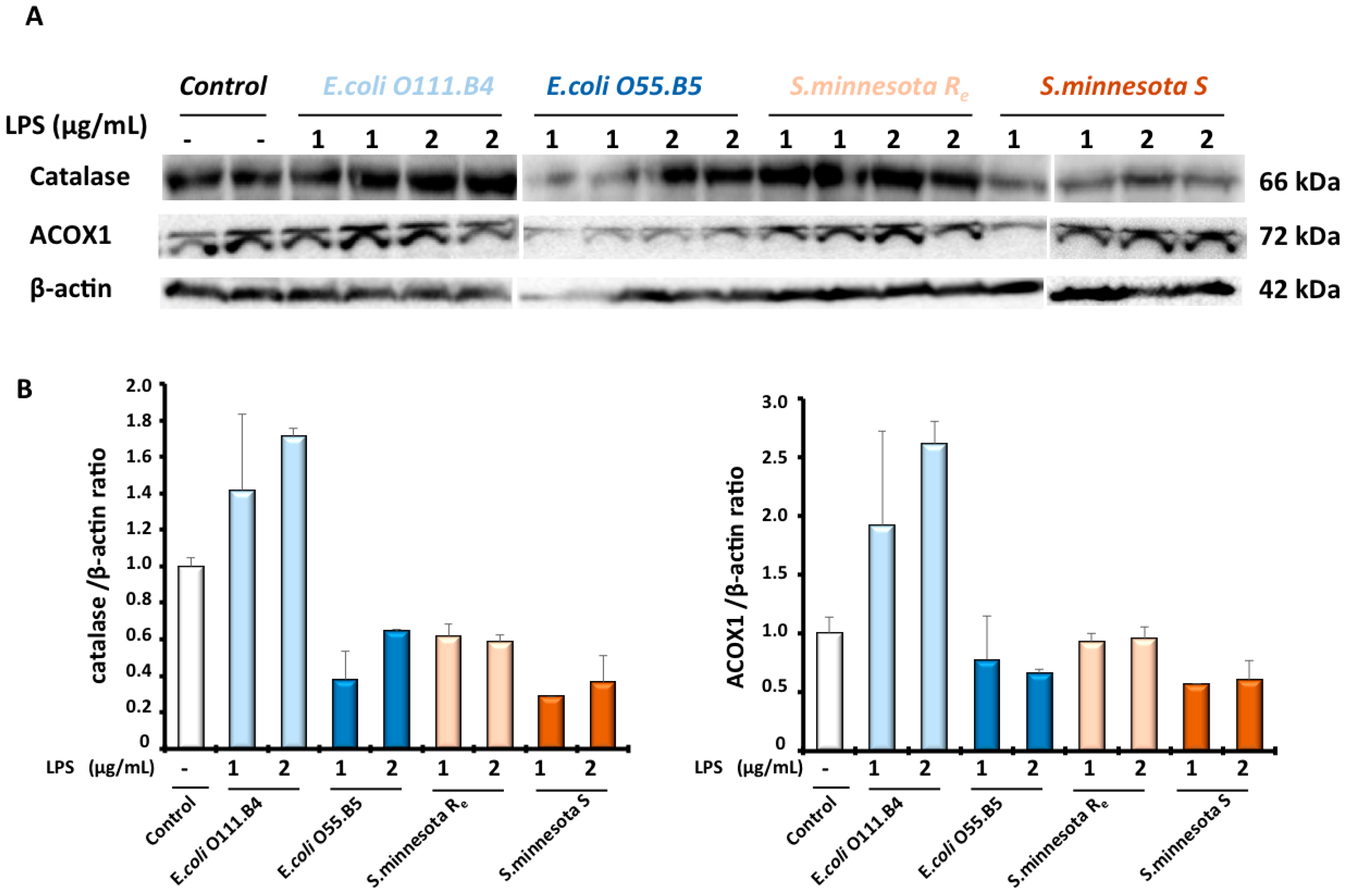 Expression levels of ACOX1 and catalase proteins were evaluated by Western blotting analysis in BV-2 cell extracts after LPS treatment with the four different serotypes (1–2 µg/mL) for 24 h (A). Expression of protein was quantified by densitometry analysis and normalized to the β-actin; (B) and values represent the fold induction relative to the control.