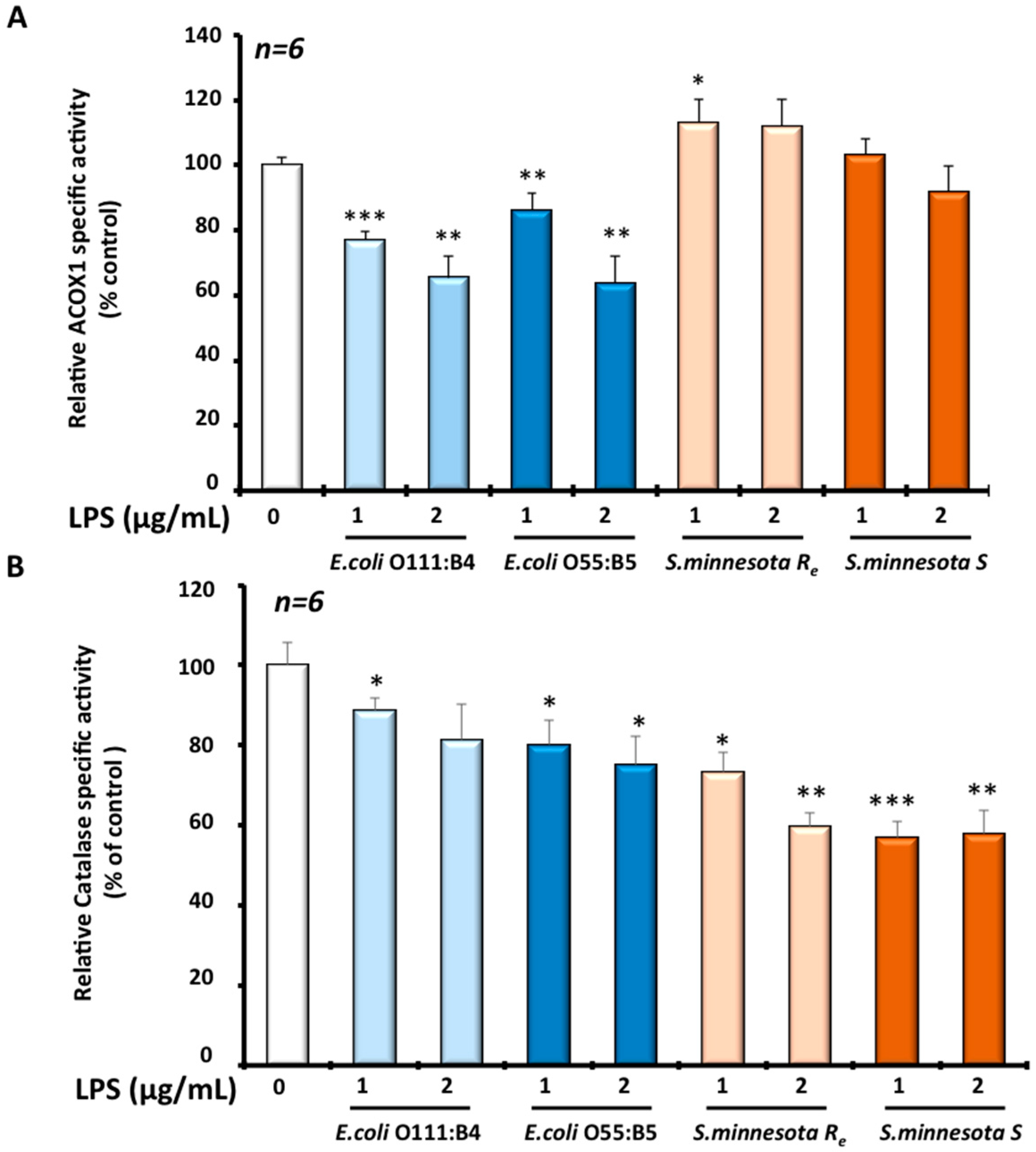 Enzymatic specific activities of (A) ACOX1 and (B) catalase were measured in BV-2 microglial cells treated for 24 h with the four different serotypes of LPS (1 or 2 µg/mL). The results were the mean ± SD of the three independent experiments. Values were normalized to the control and are given as percent of the control. The statistical significance was calculated with the Student-t test: p < 0.05 for *; p < 0.01 for **; p < 0.001 for ***.