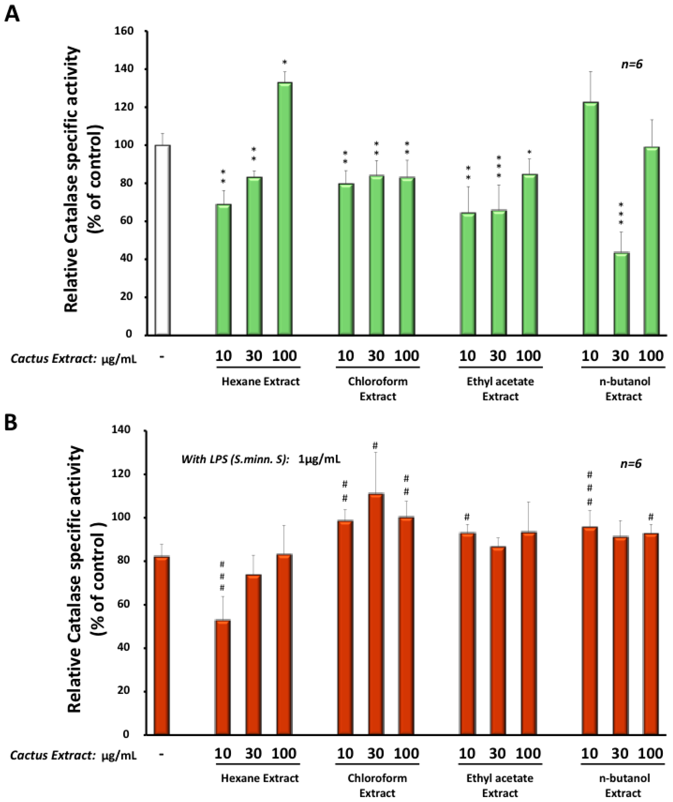Intriguingly, extracts obtained with hexane, chloroform or ethyl-acetate decreased significantly the catalase activity between −20% and −55% in BV-2 cells after 24 h treatment, except for the hexane extract at the concentration of 100 µg/mL, showing an increase of 30% (Figure 5A). In the presence of LPS (from Salmonella minnesota S serotype) (Figure 5B), low dose, at 10 µg/mL, of the hexane extract, we observed a greater decrease (−45%) in catalase activity when compared to the LPS treatment alone. However, higher concentrations of the hexane extract or different doses of the other Opuntia extracts (chloroform, ethyl-acetate or n-butanol) reestablished catalase activity at the same or higher level than the control (Figure 5B). Interestingly, treatment with different extracts had no significant effect on catalase at the protein level (data not shown). This indicates that changes in catalase activity were the result of the modulation of the enzymatic activity.