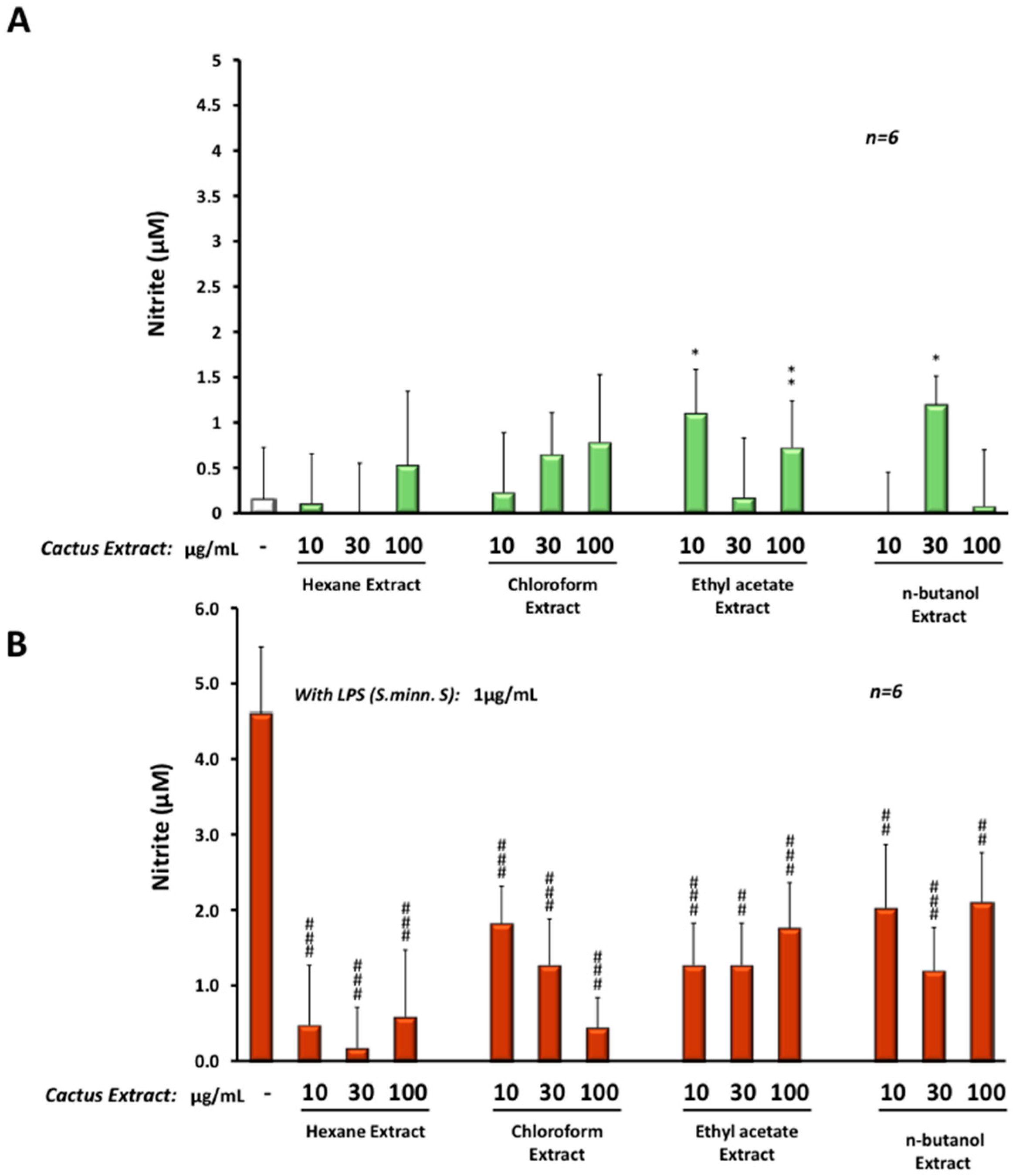 To evaluate the anti-inflammatory protective effect of these cactus extracts, we treated microglial BV-2 cells with different extracts at three concentrations: 10, 30 or 100 µg/mL (using DMSO as vehicle) in the presence or absence of LPS from Salmonella minnesota S serotype. This serotype was chosen because of its significant effect on catalase activity. After 24 h of treatment, different cactus extracts induced a very slight production (up to 1 µM) of NO when compared to the control (Figure 6A). All extracts reduced the effect of LPS (24 h treatment at 1 µg/mL) on NO production in BV-2 cells, from 4.7 µM under LPS treatment alone to less than 2 µM in the presence of the cactus extract. However, hexane and chloroform extracts were the most efficient in reduction of NO production induced by LPS, with less than 1 µM of NO in a dose-dependent manner (Figure 6B).