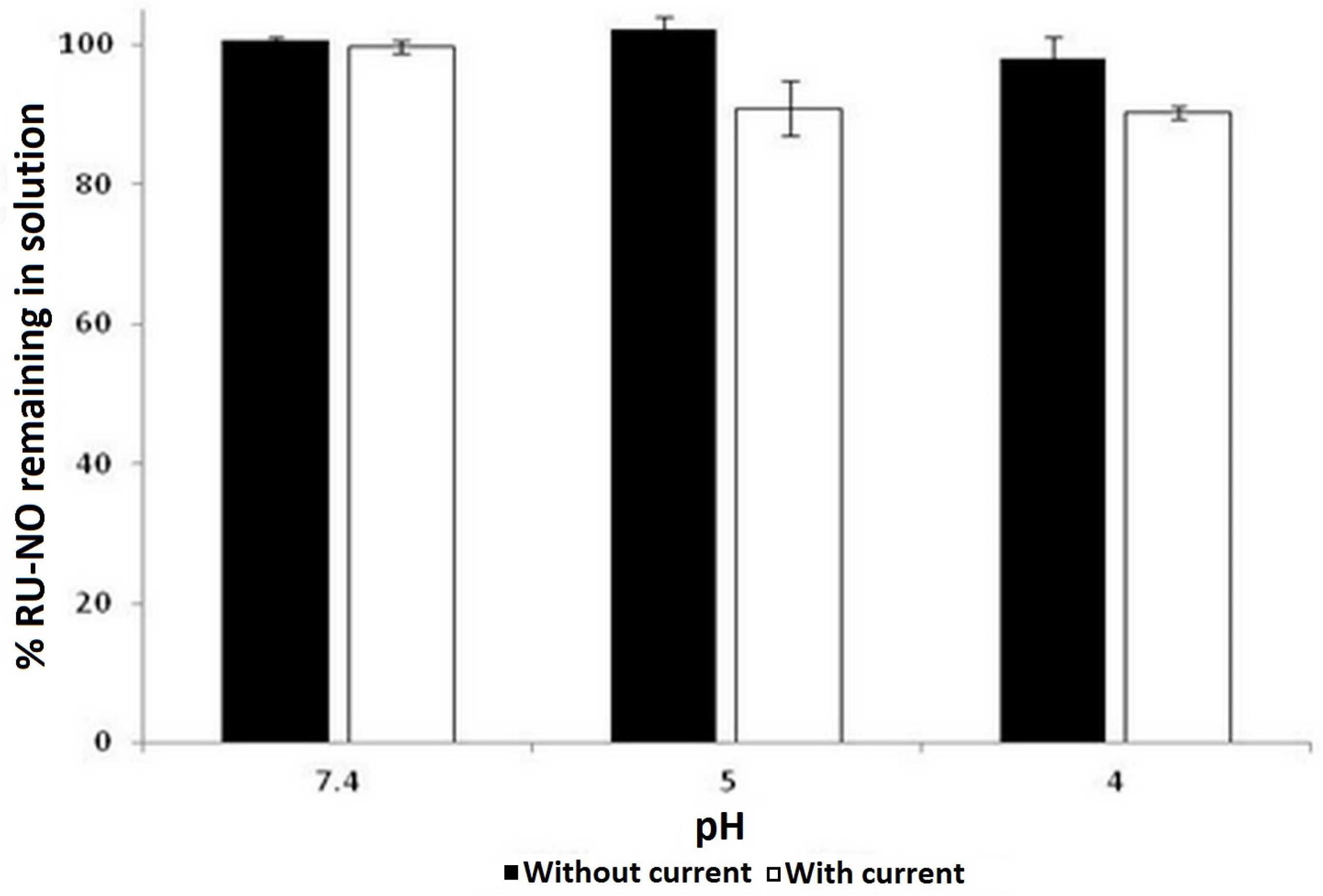 Saturated solutions of Ru-NO complex in isotonized HEPES buffer (25 mM) was prepared at three different pH of 4, 5 and 7.4. The stability of Ru-NO solutions at these pHs was then evaluated under constant low intensity electric current connected in series using Ag/AgCl electrodes. The anode (Ag) was immersed in the Ru-NO solution while the cathode (AgCl) was immersed in isotonized HEPES buffer (25 mM, pH 7.4). The solutions were connected by a salt bridge and subjected to an electric current of 0.4 mA for 6 h. After 6 h, the amount of Ru-NO remaining in the solution was quantified by HPLC. The stability of the complex in the absence of electric current was also evaluated. Experiments were performed in duplicate at all pHs.