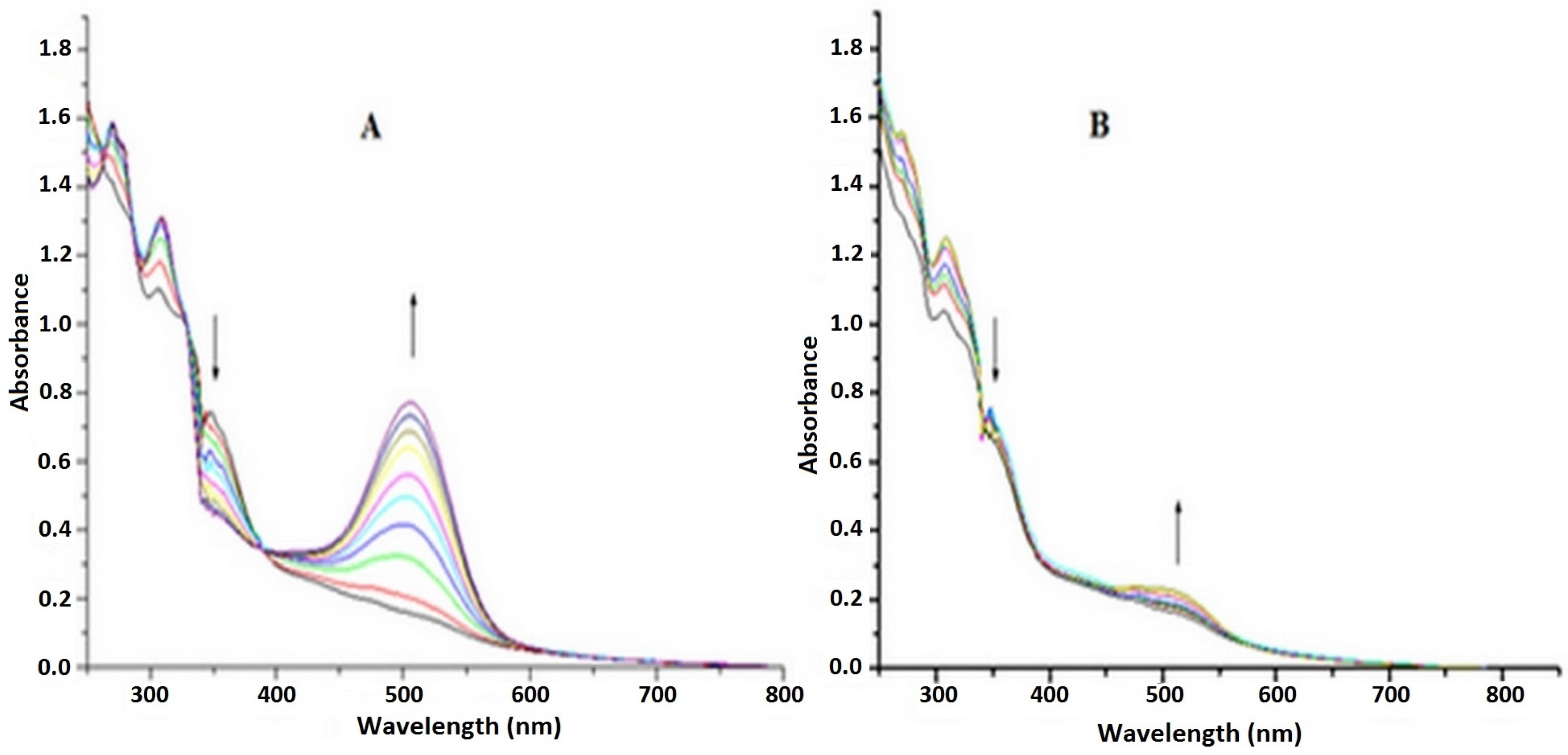 Laser irradiation of Ru-NO solution at pH 7.4 was performed at two wavelengths of 355 nm and 532 nm, selected based on previously verified quantum yield [26]. Figure 4A shows the spectral variation in the Ru-NO complex in HEPES buffer (pH 7.4) after laser irradiation at 355 nm. The result shows a decrease in the band at 360 nm and an increase at 510 nm, indicating the release of NO, substitution of the NO by the H2O molecule, and the consequent formation of the Ru-aqueous complex which absorbed at 510 nm [26].