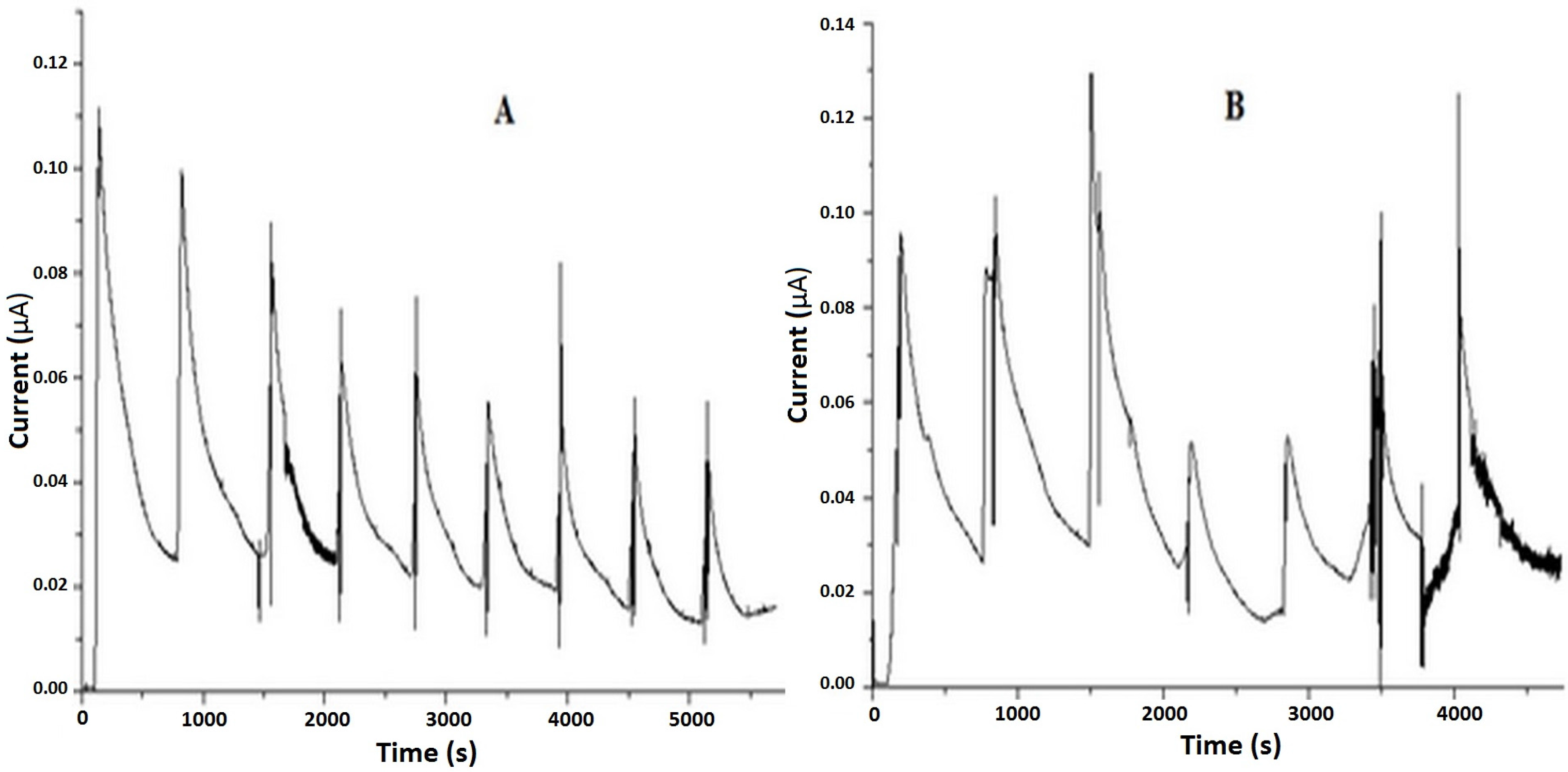 Qualitative cronoamperogram of NO release from Ru-NO complex in HEPES buffer (pH 7.4) laser irradiated at (A) 355 nm (laser power 10 mW) and (B) 532 nm (laser power 30 mW).