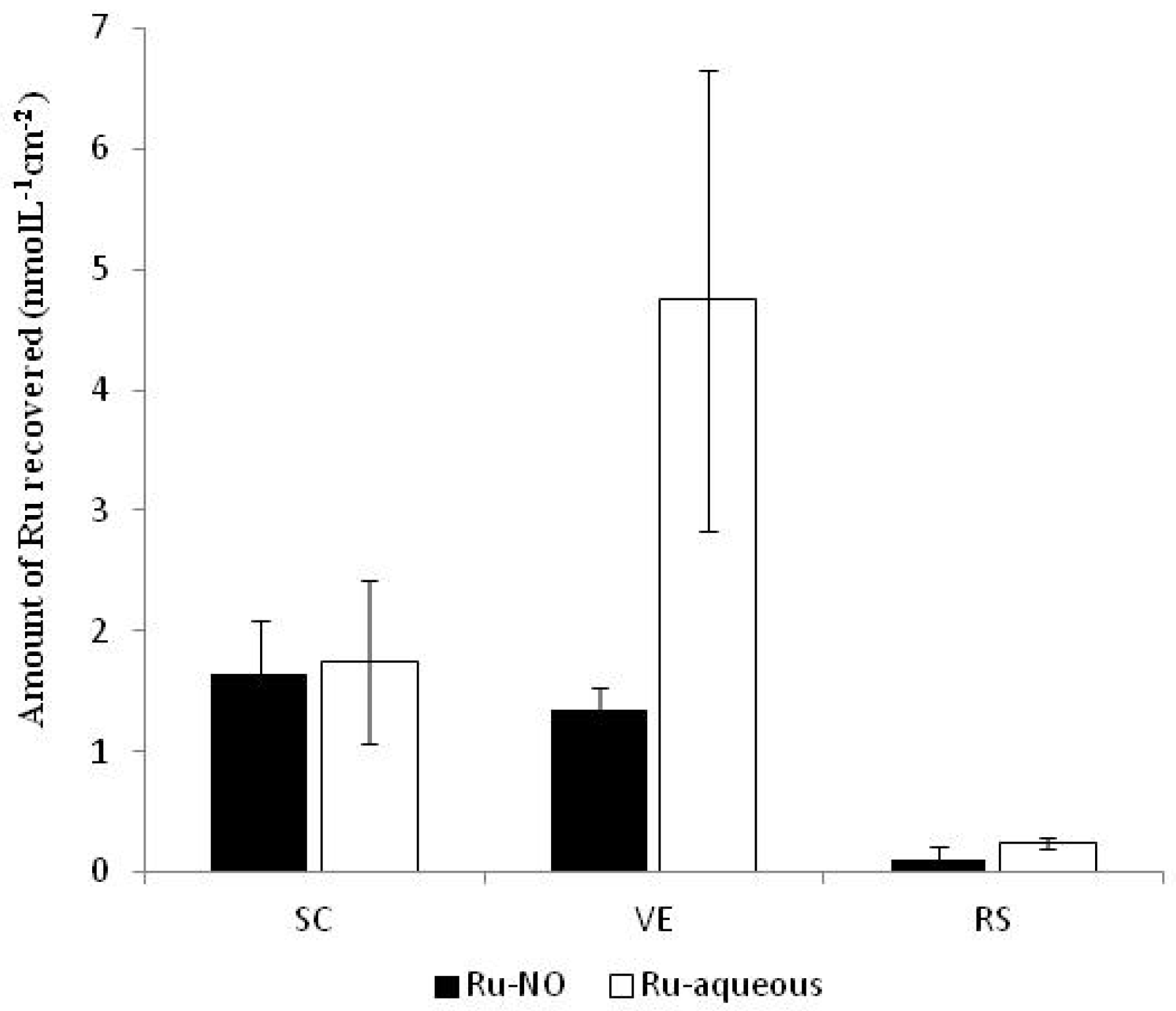 Ru-NO and Ru-aqueous recovered from the SC and viable epidermis after 4 h of iontophoresis.