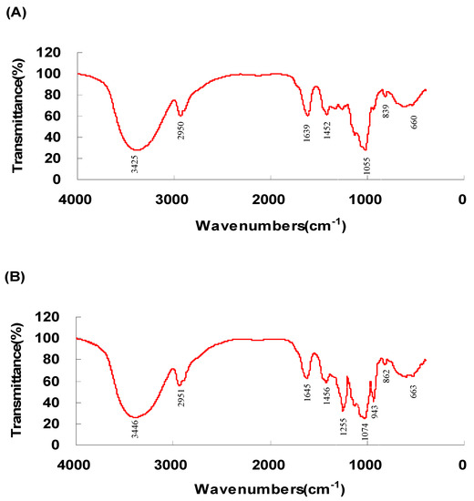 In this study, the organic functional groups of pRCPS were detected using Infrared (IR) spectra (FTIR-8400S, Shimadzu Co., Kyoto, Japan), and the purified RCPS and pRCPS was dried and ground with KBr powder and pressed into pellets for FT-IR measurement. The IR characteristic of pRCPS between the range of 4000 cm−1 and 400 cm−1 were measured.