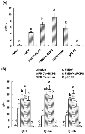 Effect of the pRCPS on antibody level. Blood samples were collected and serum was prepared from immunized mice in all groups on Day 14 after the second immunization for ELISA. The FMDV-specific IgG (A) and IgG2a, IgG1, and IgG2b (B) were determined by ELISA as described in Experimental Section. The concentration of IgG and IgG isotopes are presented as mean ± standard deviation. The different letters on a column differ significantly (n = 10, p < 0.05).