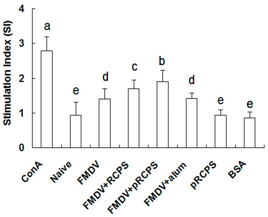 Splenocyte proliferation results show the splenocyte proliferation levels in the pRCPS groups were remarkably higher than the RCPS group, alum group, FMDV group, naive groups, and BSA groups (p < 0.05) (Figure 3). In this experiment, pRCPS employed as an adjuvant dramatically enhanced splenocyte proliferation levels compared to FMDV group.