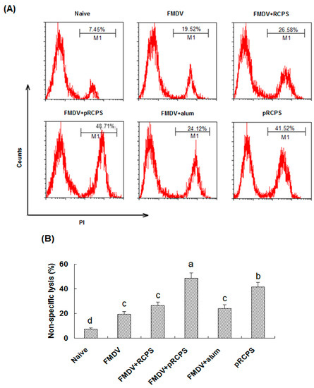 It is well known that CTL responses play an important part in the protection against viruses and other intracellular pathogens. The effects of pRCPS on CTL responses show the percentage of FMDV-specific lysis of the target cells in mice in the FMDV + pRCPS groups was 74.33% (Figure 4A,B). The percentage of lysis in the RCPS, alum, FMDV and naive groups was 62.20%, 45.26%, 30.66%, and 5.55%, respectively. Our results showed that pRCPS significantly promoted FMDV-specific cytotoxic responses compared to RCPS group, alum group, FMDV group, and naive group (p < 0.05), suggesting pRCPS can significantly increase CTL activity.
