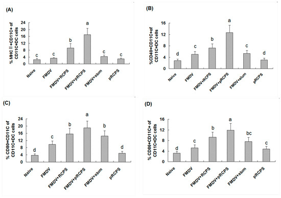 Effect of pRCPS as an adjuvant on the maturation of DCs. The spleens were removed from immunized mice on Day 3 after the first immunization, and the splenocytes suspensions were prepared. The cells were double stained with anti-CD11c-FITC and anti-MHC II-PE, anti-CD11c-FITC and anti-CD80-PE, anti-CD11c-FITC and anti-CD86-PE, or anti-CD11c-FITC and anti-CD40-PE respectively. Then, the expression levels of surface molecular (MHC II, CD40+, CD80+, and CD86+) were analyzed using FACS. FITC stained positive cells were represent DC cells, The PE stained positive cells are represent the cells which expressed surface molecular. The PE and FITC double positive cells identified as those DCs which expressed surface molecular. The percentage of PE and FITC double positive cells in total cells were selected and recorded in each sample. The percentage of MHC II, CD40+, CD80+, and CD86+ in total DCs are shown in (A–D). The values are presented as mean ± standard deviation. The different letters on a column differ significantly (n = 10, p < 0.05).