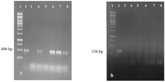 PCR products of transformed hairy roots derived from L. racemosa. (a) Amplifying a 490 bp fragment of the rolC gen of A. rhizogenes ATCC 15834. Lane 1: 1 Kb DNA marker; lane 2: Positive control, PCR product from total DNA of A. rhizogenes ATCC 15834; Lane 3: Negative control, PCR product from total DNA of non-transformed roots of L. racemosa; lanes 4–8: PCR products from total DNA of 5 hairy root lines derived from L. racemosa, (lines 7.31, 6.14, 6.4, 3.1 and 17.6, respectively); (b) Amplifying a 338 bp fragment of the virD gen of A. rhizogenes ATCC 15834. Lane 1: 1 Kb DNA marker; lane 2: Positive control, PCR product from total DNA of A. rhizogenes ATCC 15834; lane 3: Negative control, PCR product from total DNA of non-transformed roots of L. racemosa; lanes 4–8: PCR products from total DNA of 5 hairy root lines derived from L. racemosa.