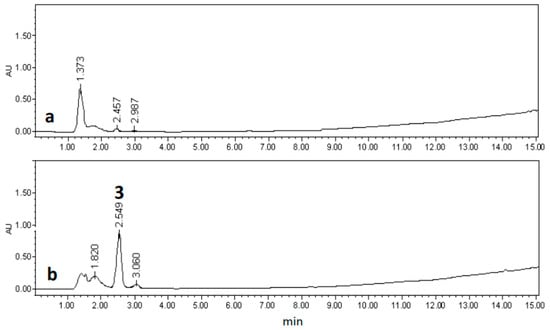 HPLC profiles of (a) CH2Cl2:CH3OH extract and (b) Fraction C1F3 obtained from hairy root line LRT 7.31.