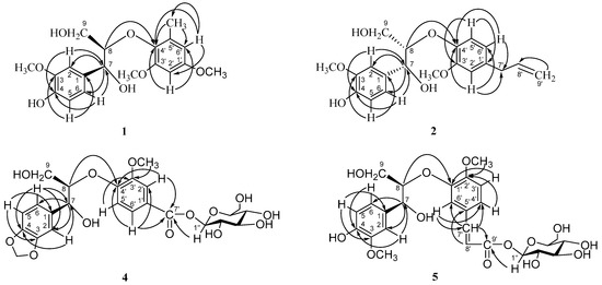 Compound 2 was isolated as an amorphous powder. The molecular formula, C20H24O6, was established by HRMALDIMS (m/z 383.1457 [M + Na]+, calcd. 383.1465). The IR absorptions of 2 were indicative of the presence of a hydroxyl group (3423 cm−1) and a C=C double bond (1639 cm−1). The 1H-NMR signals of two oxygenated methine protons (δ 4.82 (1H, d, J = 5.4 Hz, H-7) and 4.28 (1H, m, H-8)), an oxygenated methylene group (δ 3.75–3.83 (2H, m, H-9)), and HMBC correlations from H-2 and H-6 to C-7, and H-8 to C-4′ (Figure 3), supported the idea that 2 could be a 8-O-4′ type of neolignan [28]. The 1H-NMR spectrum showed the presence of a 3-methoxyl-4-hydroxyphenyl unit (δ 7.00 (1H, d, J = 2.4 Hz, H-2), 6.73 (1H, d, J = 8.4 Hz, H-5), 6.82 (1H, dd, J = 8.4, 2.4 Hz, H-6) and a methoxyl group at δ 3.79 (3H, s)), which was supported by the HMBC spectrum. In addition, the 1H-NMR spectrum of 2 also showed an additional trisubstituted aromatic ring with an ABX system protons at δ 6.75 (1H, d, J = 1.8 Hz, H-2′), 6.83 (1H, d, J = 7.2 Hz, H-5′), 6.64 (1H, dd, J = 7.2, 1.8 Hz, H-6′) and a methoxyl group at δ 3.76 (3H, s). Furthermore, by the analysis of 1H-, 13C-NMR and 1H-1H COSY spectra, the signals at δ 3.28 (2H, d, J = 5.4 Hz, H-7′) and δ 39.4 (C-7′), 5.92 (1H, m, H-8′) and 137.7 (C-8′), and 5.03 (2H, m, H-9′) and 114.4 (C-9′) showed the existence of an allyl group. The long-range correlations between H-2′ and C-4′, C-7′, H-6′ and C-4′, C-7′, H-5′ and C-1′, C-3′, and methoxyl protons (δ 3.76) and C-3′ were observed in the HMBC spectrum (Figure 3), which led to the trisubstituted aromatic ring being determined as a 1-allyl -3-methoxylphenyl unit.