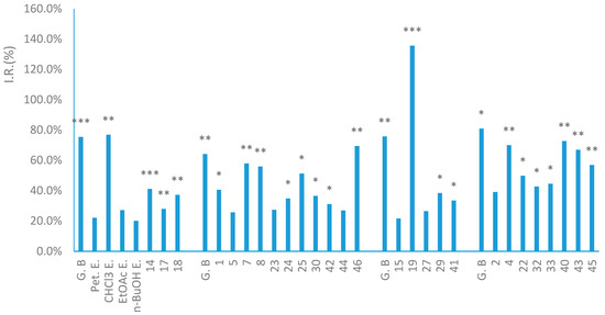 I.R. (%) = (ODmodel − ODsample)/(ODmodel − ODcontrol) × 100%.