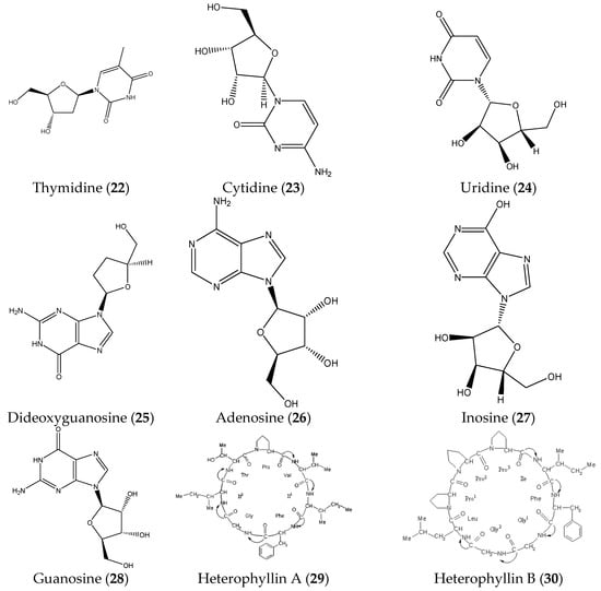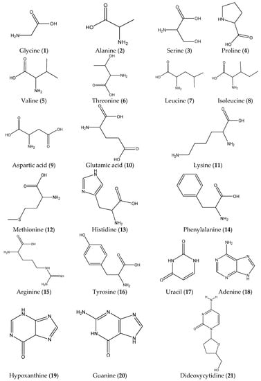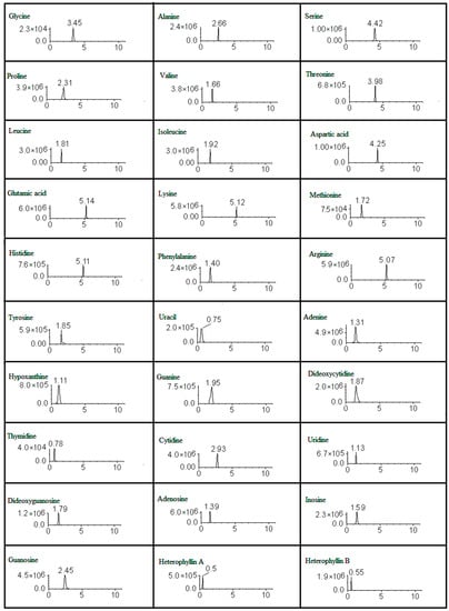 The reference compounds of glycine (1), alanine (2), serine (3), proline (4), valine (5), threonine (6), leucine (7), isoleucine (8), aspartic acid (9), glutamic acid (10), lysine (11), methionine (12), histidine (13), phenylalanine (14), arginine (15), tyrosine (16), uracil (17), adenine (18), hypoxanthine (19), guanine (20), dideoxycytidine (21), thymidine (22), cytidine (23), uridine (24), dideoxyguanosine (25), adenosine (26), inosine (27), and guanosine (28) were purchased from Shanghai Yuanye-Biotechnology Co., Ltd. (Shanghai, China). Heterophyllin A (29) and heterophyllin B (30) were kindly provided by Professor Ninghua Tan (Kunming Institute of Botany, Chinese Academy of Science, Kunming, China). The structures of the 30 reference compounds are shown in Figure 2. The purity of all compounds by HPLC analysis was greater than 98%. Formic acid of MS grade and acetonitrile were purchased from Merck (Darmstajt, Germany). Ultrapure water was prepared using a Milli-Q water purification system (Millipore, Bedford, MA, USA).