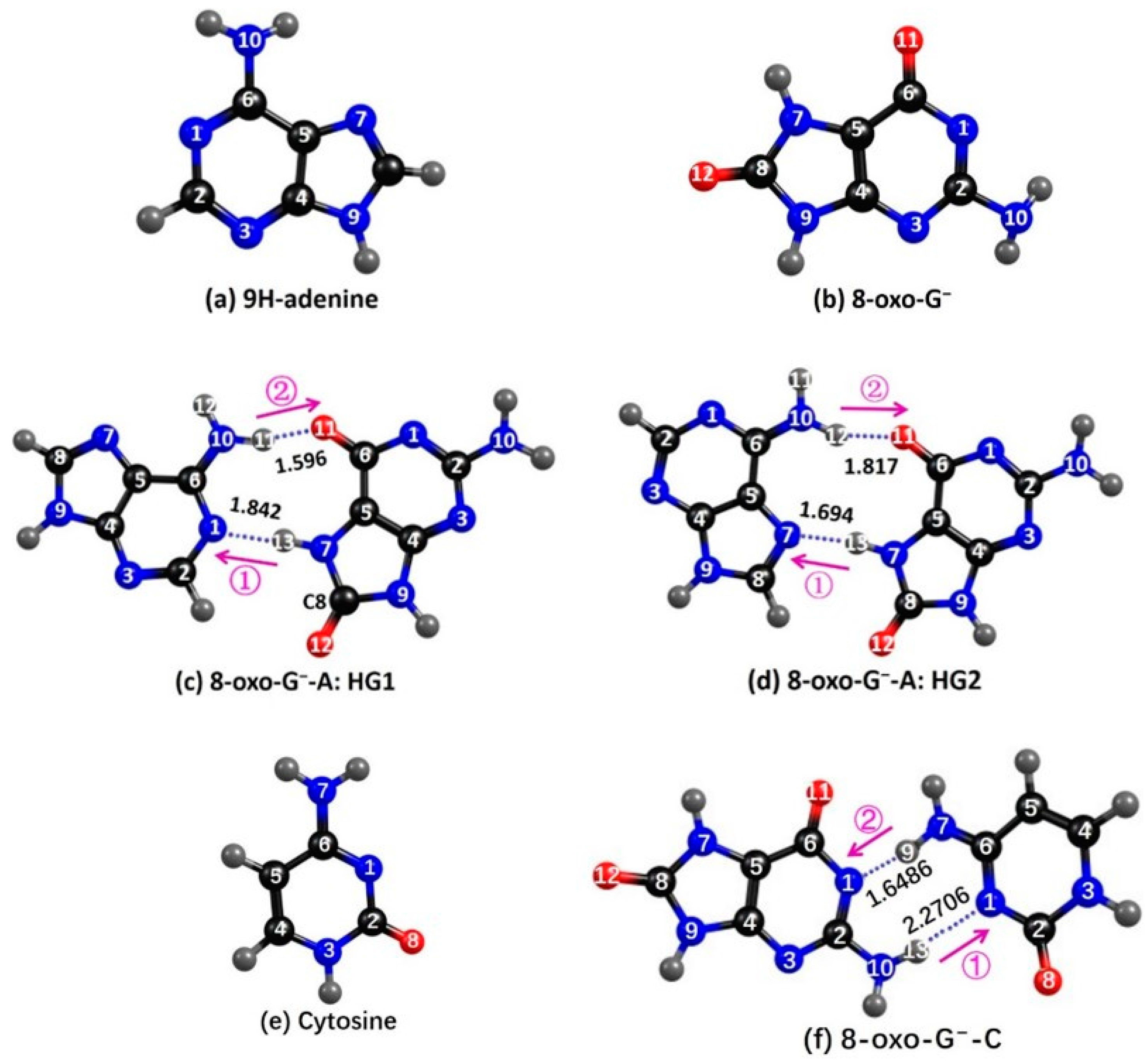 Ground-state equilibrium geometry of (a) isolated 9H-adenine; (b) isolated 8-oxo-G−; (c) HG1 form of 8-oxo-G—A; (d) HG2 form of 8-oxo-G—A; (e) isolated cytosine; and (f) 8-oxo-G−-C.