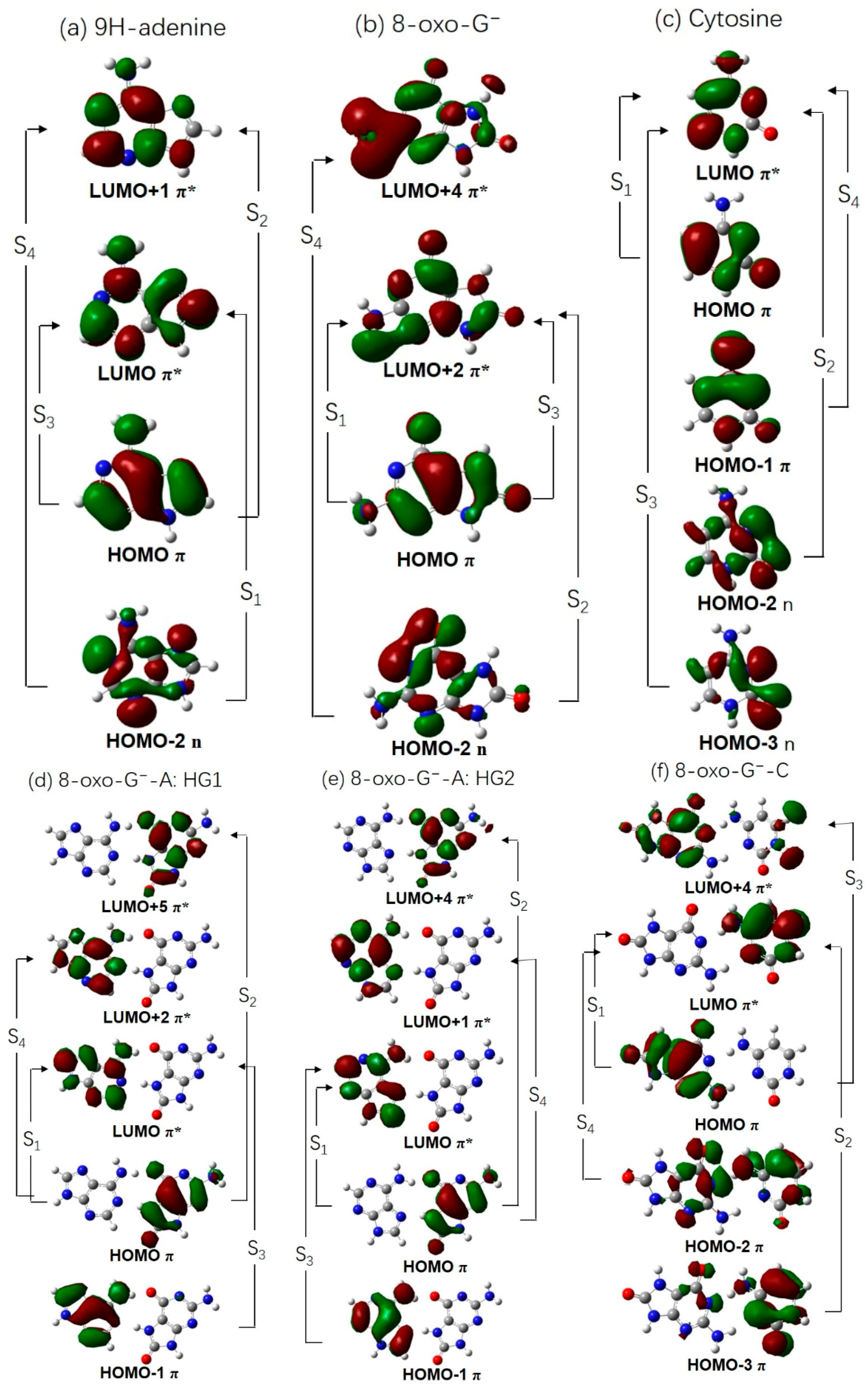 Figure 2f depicts the orbital promotions associated with the 8-oxoG−-C base pair. As shown, the electronic excitation to S1 involves a π to π* electron promotion in which the former is localized on the 8-oxoG− moiety, whereas the latter is localized on the C moiety. As with the 8-oxo-G−-A base pairs, electronic excitation to S1 involves a significant charge separation and is thus of CT character. In contrast, electronic excitation to the S2, S3, and S4 states involves electron promotions between π/n to π* orbitals that are localized on the same nucleobase within the base pair. The observed orbital ordering is very similar to that of the WC-type G-C base pair which also has an S1 state of CT character, whilst the higher-lying states are of LE character [34,35].