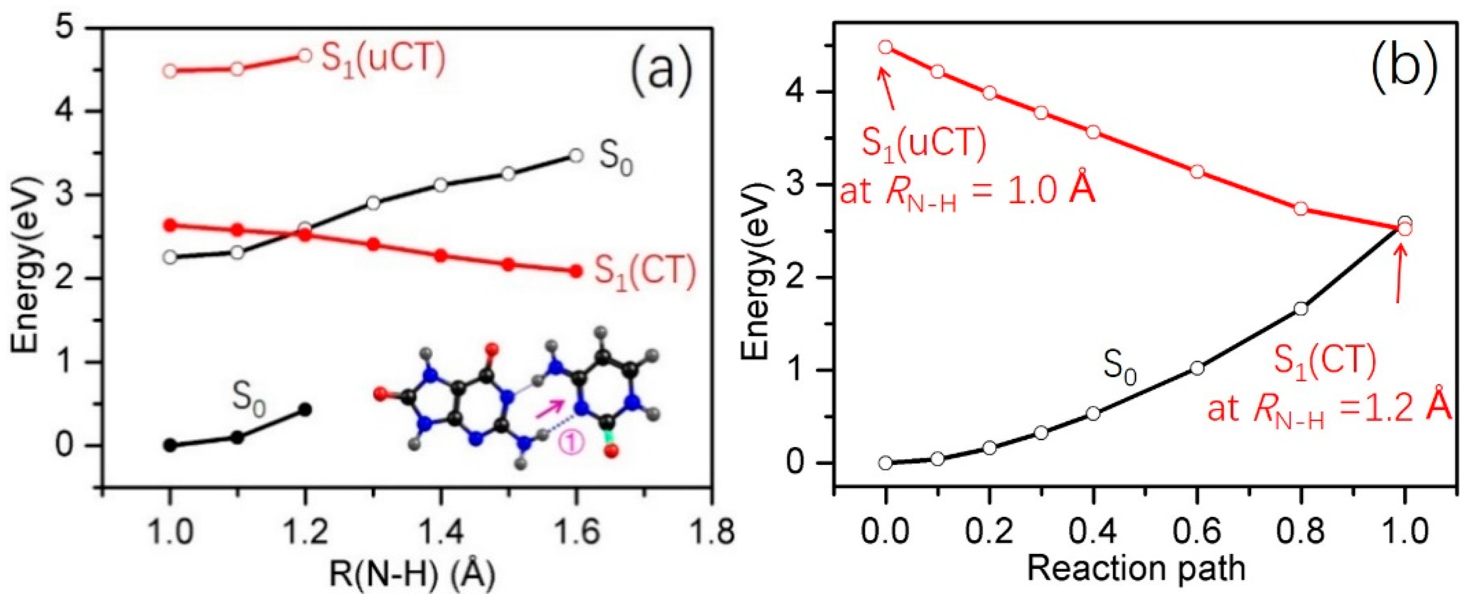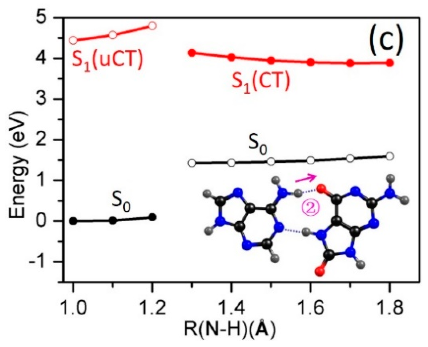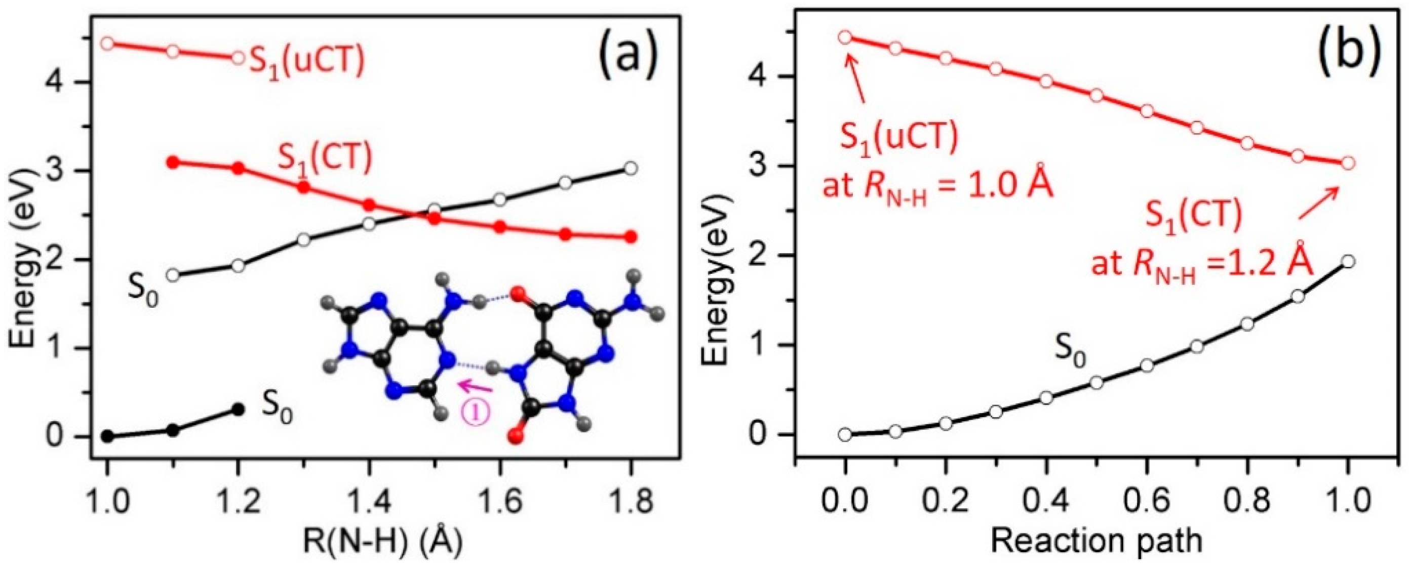 Figure 3a shows the PE profiles associated with proton transfer along N7−H13•••N1 (Path 1, see inset in Figure 3a) in the HG1 base pair. The S0 energies calculated along the reaction path relaxed in the S0 state rise steadily upon RN7−H13 bond extension, showing that proton transfer is unfavorable in this electronic state. When the energy of the 1ππ*(uCT) state is optimized for fixed RN7−H13 = 1.2 Å, the electronic character of this state changes from LE character to CT character, which implies the transfer of an electron localized on 8-oxo-G− to the π* orbital localized on 9H-adenine, resulting in an electronic charge separation. The path connecting the 1ππ*(uCT) state at RN7−H13 = 1.0 Å to the 1ππ*(CT) state at its optimized geometry for RN7−H13 = 1.2 Å was constructed as a linearly interpolated reaction path. The corresponding energy profile is shown in Figure 3b. This energy profile exhibits no barrier, which ensures that the minimum-energy path connecting the 1ππ*(uCT) and 1ππ*(CT) states is barrierless. The relaxed 1ππ*(CT) profile (Figure 3a, full red circles) shows a strong decrease of the energy as a function of RN7−H13 stretching; this represents the driving force towards proton transfer that results from the charge-separated character of the 1ππ*(CT) state, which is characteristic of EDPT [71]. The S0 energy computed at the 1ππ*(CT)-relaxed geometries (Figure 3a, black open circles) increases as a function of the RN7−H13 stretching coordinate. As a result, the energies of the 1ππ*(CT) state and the S0 state cross at RN7−H13 ≈ 1.45 Å. This S1/S0 crossing becomes a CI when the appropriate coupling modes are taken into account. Depending on the topography of the PE surfaces and the nonadiabatic coupling at the CI, the reaction can lead to internal conversion to the S0 state of the complex (adiabatic path) or to a biradical.