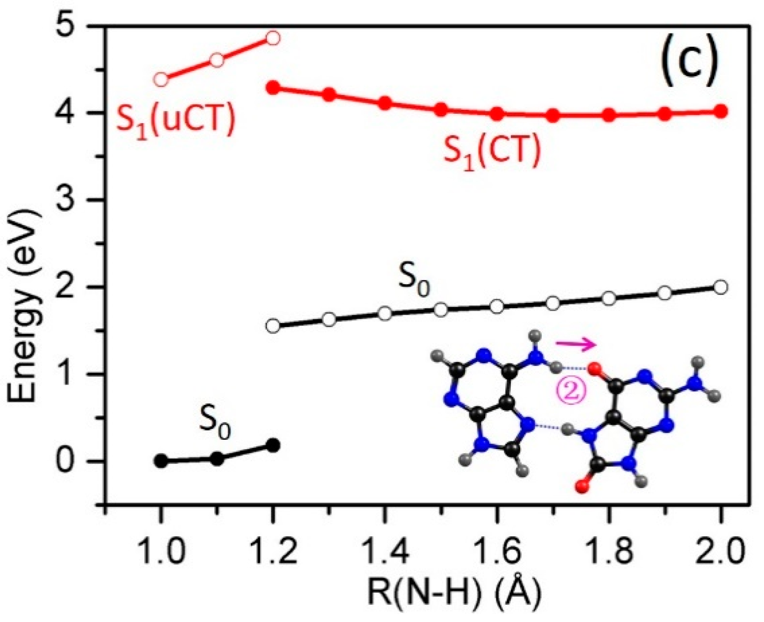 Sobolewski and Domcke and de Vries and coworkers proposed a photoprotective role of excited-state proton transfer in the G-C Watson-Crick (WC) base pair [27,34,35,66]. In these theoretical and experimental studies, the authors suggested that ultrafast excited-state deactivation occurs by inter-base electron-driven proton transfer (EDPT) from G to C. The ab initio electronic-structure calculations identified a low-lying 1ππ* charge-transfer (CT) state (arising via an electron promotion from a G-centered π orbital to a C-centered π* orbital). The CT state drives the transfer of a proton from guanine to cytosine. While the CT state is stabilized by the proton transfer, the ground state is destabilized, which results in a barrierless reaction path leading to a low-energy CI of the S1 state with the S0 state. These findings are supported by pump-probe experiments in solution [21] as well as by recent transient UV pump and IR probe experiments in the gas phase [22]. The inter-base EDPT reaction was shown to be the main path by which internal conversion to the ground state proceeds in the G-C WC base pair in the gas phase and in the bulk DNA environment [27,29,30,31,32,34,35,36,66]. For the A-T WC base pair, EDPT has also been identified as an efficient deactivation path after photoexcitation by ab initio calculations [28,30,33], although an experimental verification of the predicted ultrashort lifetime of the A-T WC base pair is still lacking.