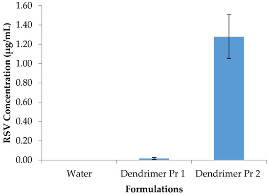RSV in excess (2.0 mg) was added to amber vials containing methanol (500 µL) and vortexed for 15 s. RSV in methanol was then transferred into new amber vials containing dendrimer (1 mg, 33.0 µL) and Millipore water (467 µL). Each vial was sonicated for 15 s in three 5-s intervals and placed in an orbital water bath shaker and shaken at 37 °C, protected from light using aluminum foil for at least 2 h. Upon completion of shaking, the vials underwent lyophilization overnight to remove water and methanol, and were reconstituted with Millipore water (1000 µL). The formulations were placed in an orbital water bath shaker (37 °C), protected from light using aluminum foil and shaken for 2 h. The suspensions were filtered through a 13 mm 0.2 µm nylon syringe filter. One hundred μL of formulation was then diluted with HPLC-grade methanol in amber HPLC vial and analyzed by HPLC for RSV concentration.