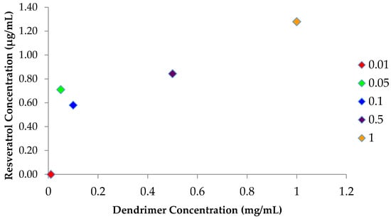 After establishing methods to entrap RSV in dendrimer, the efficacy of formulation was evaluated by reducing the amount of dendrimer from the original amount of 1.0 mg used to entrap RSV. The purpose was to vary the concentrations of dendrimer, while holding the concentration of added RSV constant. The following dendrimer concentrations were tested using Protocol 2: 0.01, 0.05, 0.1 0.5 and 1 mg/mL. The solubility profile (