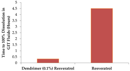 An examination was made regarding dissolution of RSV in simulated gastric and intestinal environments. Simulated gastric and intestinal fluids were prepared, with the simulated gastric fluid consisting of HCl, NaCl, Pepsin, and water while the simulated intestinal fluid consisted of NaOH, KH2PO4, and water. 1 mL of a 0.1% dendrimer-resveratrol formulation was prepared using Protocol 2 and analyzed via HPLC. The formulation was split into two equal aliquots and lyophilized. Ten mL of the simulated solutions were added to the respective lyophilized dendrimer-resveratrol formulation, and the fluids were stirred at a low speed (1 on an arbitrary 10-point scale stir plate). This experiment was protected from light. At various time points, 0.5 mL aliquots of fluid were removed from the chambers and analyzed via HPLC. The volume removed was replenished with fresh simulated fluid. Control formulations of resveratrol alone, were analyzed simultaneously and compared to the dendrimer-containing formulations.